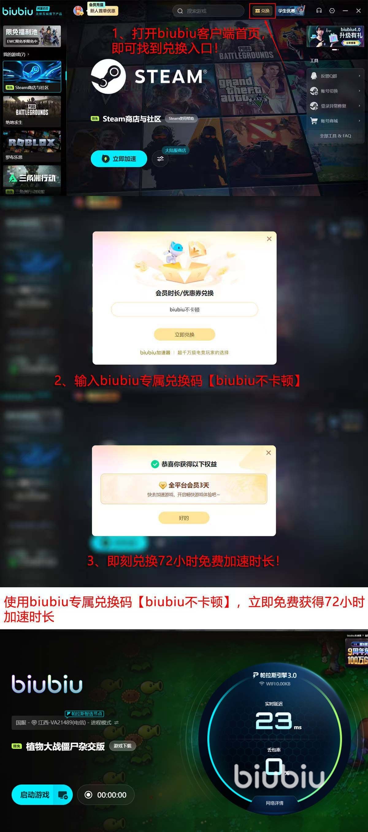 所以大家玩这款植物大战僵尸的衍生游戏时,遇到闪退问题,现在可以先领取几天免费时间,试玩几天看看效果,领取时间一个是注册新账号是系统送的24小时。一个是在首页上打开“兑换”后,输入口令【biubiu不卡顿】可以得到72小时,记住,一个人叠加总时间有96小时。