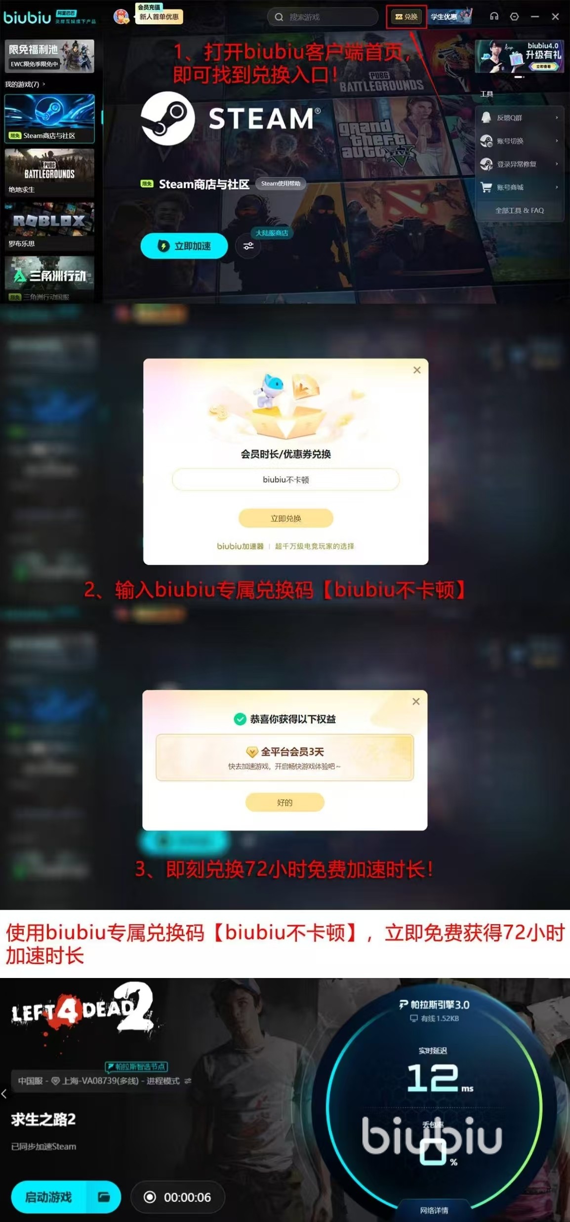 只需要注册biubiu加速器账号,就可以获得24小时的试用期,从而在没有任何限制的情况下体验加速效果。除此之外,输入兑换码【biubiu不卡顿】,新老用户可以再得72小时免费加速时间,因此新用户有96个小时可以用来进行全方位的网络稳定性检测,使大家的求生之路2游戏体验不再受网络波动的影响。