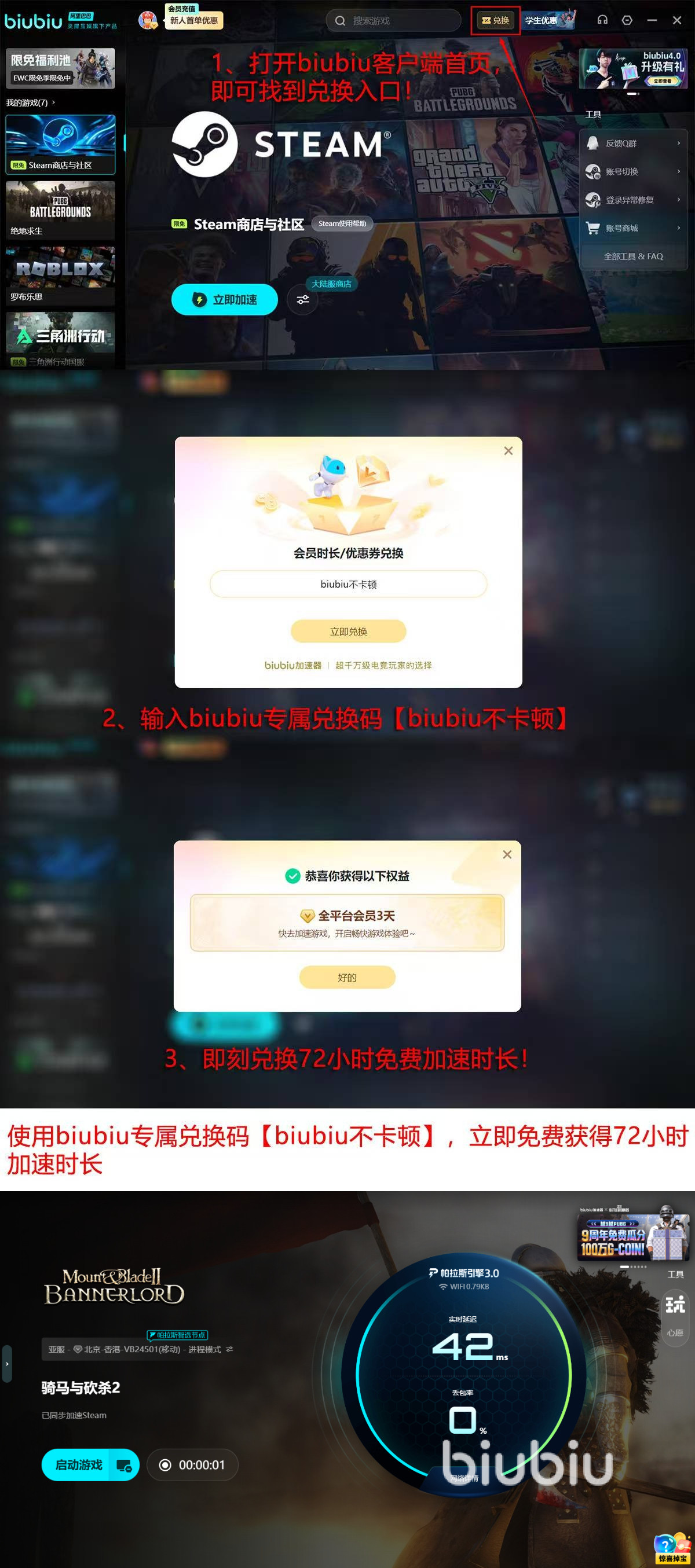 目前新用户注册即享24小时全功能免费试用,输入【biubiu不卡顿】额外再领72小时免费时长,累计畅享长达96小时的优质加速体验,让你无忧探索卡拉迪亚的联机世界。