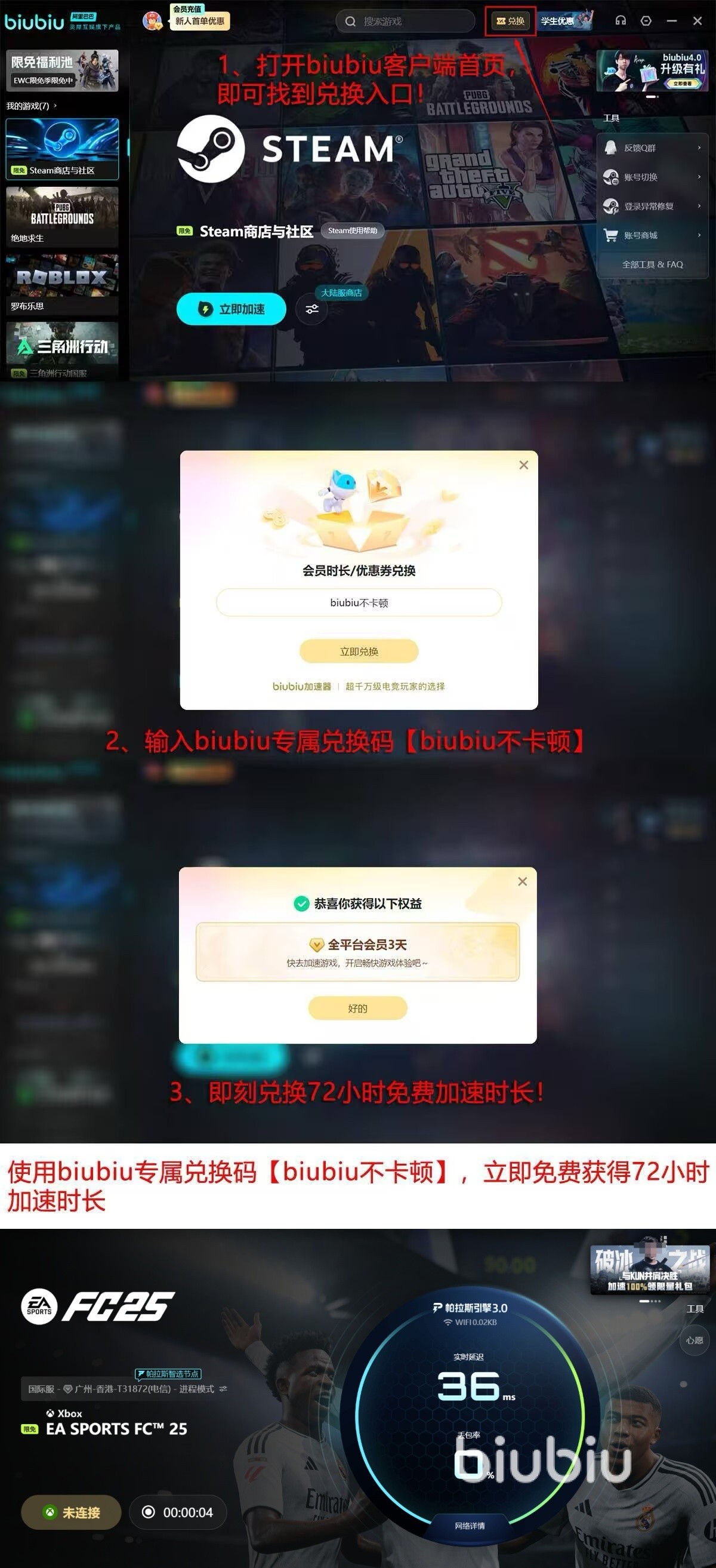 强大的效果不仅体现在数据上,更得到了绝地求生冠军选手左梓轩的认可,保证产品在经济环境下的极致稳定性,对于新玩家来说,上手体验也十分的便捷,完成注册之后直接激活24个小时免费的优化加速时间,另外还能通过输入【biubiu不卡顿】,来解锁三天的继续加速权益,四天时间足以覆盖整个周末的畅玩需求,让每位玩家都能有机会在无门槛的情况下验证加速效果。