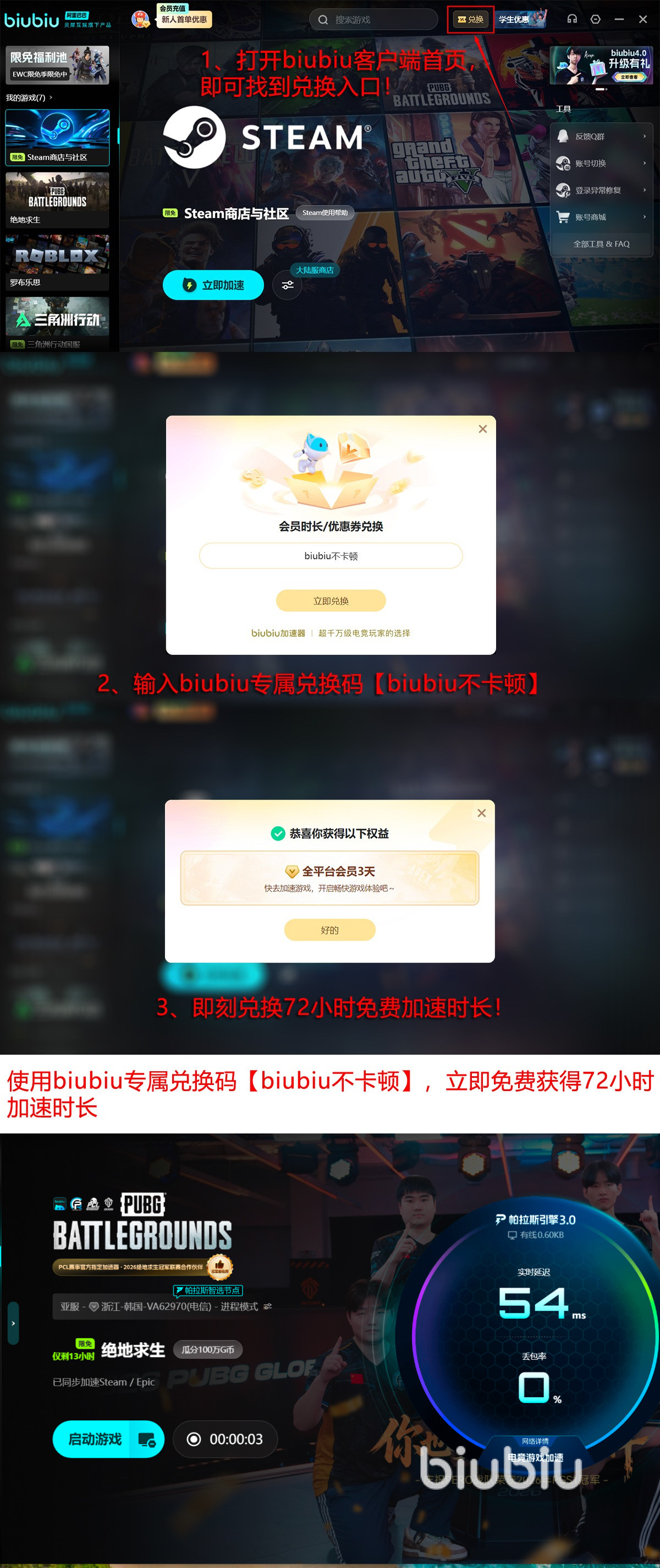 目前biubiu加速器面向新用户提供专项体验支持:注册并完成首次登录即可获赠24小时免费加速时长;所有用户(含老用户)均可通过加速器内置兑换中心,输入口令【biubiu不卡顿】,额外领取72小时加速权益。两项叠加后,新用户总计可获得96小时无限制加速服务,覆盖多日高强度对战需求。