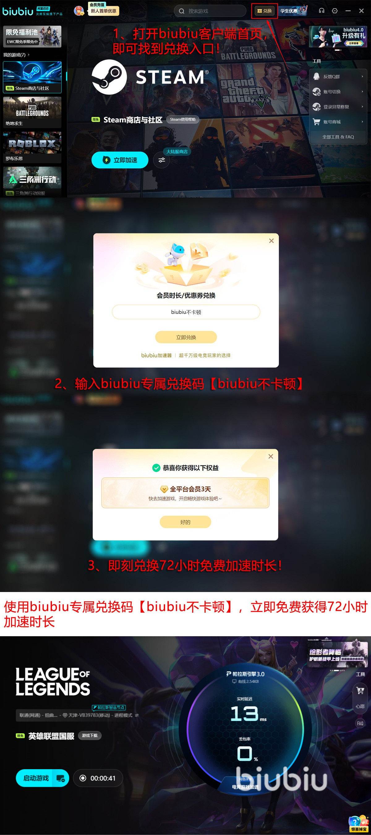 为便于用户体验,新注册用户首次激活biubiu加速器账号后,即可获得24小时免费加速时长。若试用时间不足,还可通过输入兑换码【biubiu不卡顿】额外领取72小时加速权限,累计达96小时。值得注意的是,该兑换码对老用户同样有效,可叠加至当前剩余时长中。
