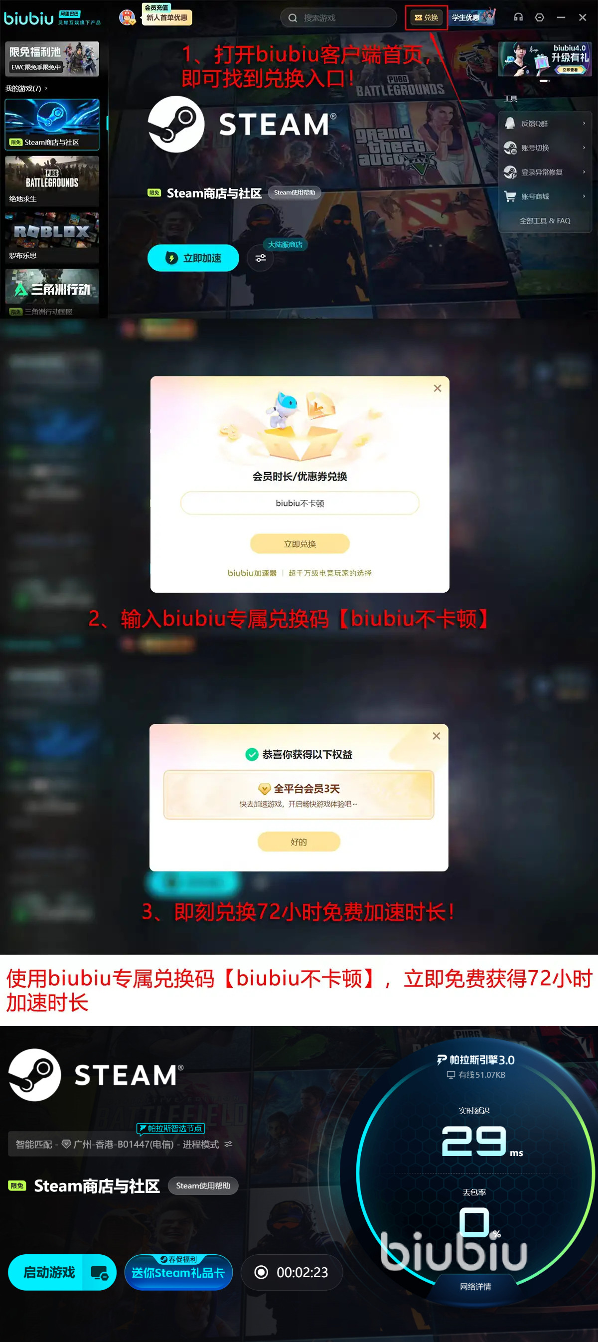 新用户注册即享24小时全游戏免费加速权限;到期后输入兑换码【biubiu不卡顿】,可额外领取72小时加速时长,累计达96小时,覆盖完整双休周期。老用户亦可凭同一兑换码获得72小时权益,无门槛复用。