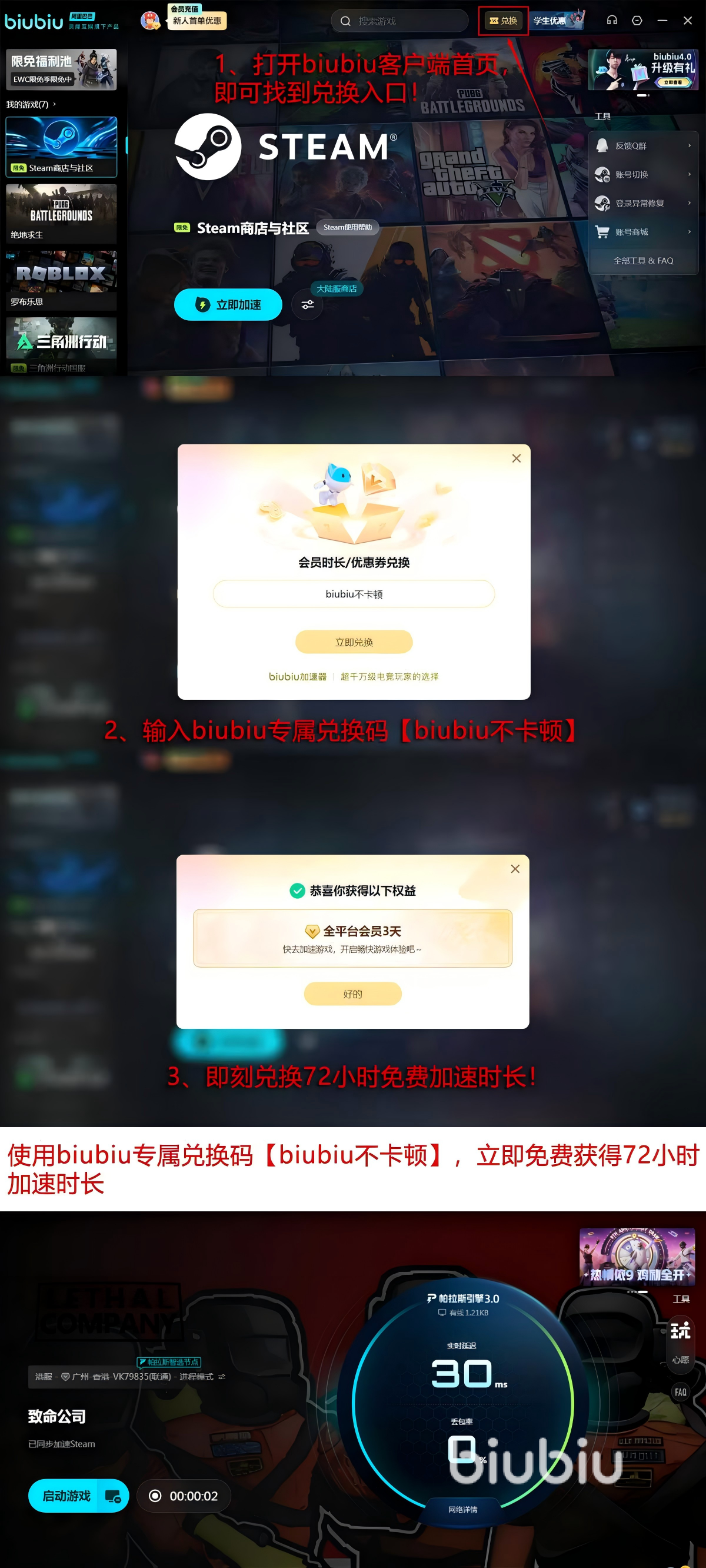新用户注册即可获得24小时免费加速服务;输入口令【biubiu不卡顿】还可额外领取72小时服务时长,两项权益可叠加,总计享96小时无限制使用权限。建议在首次启动《致命公司》前开启加速,确保Steam客户端、游戏本体及联机服务器三端通信链路全程处于优化状态。