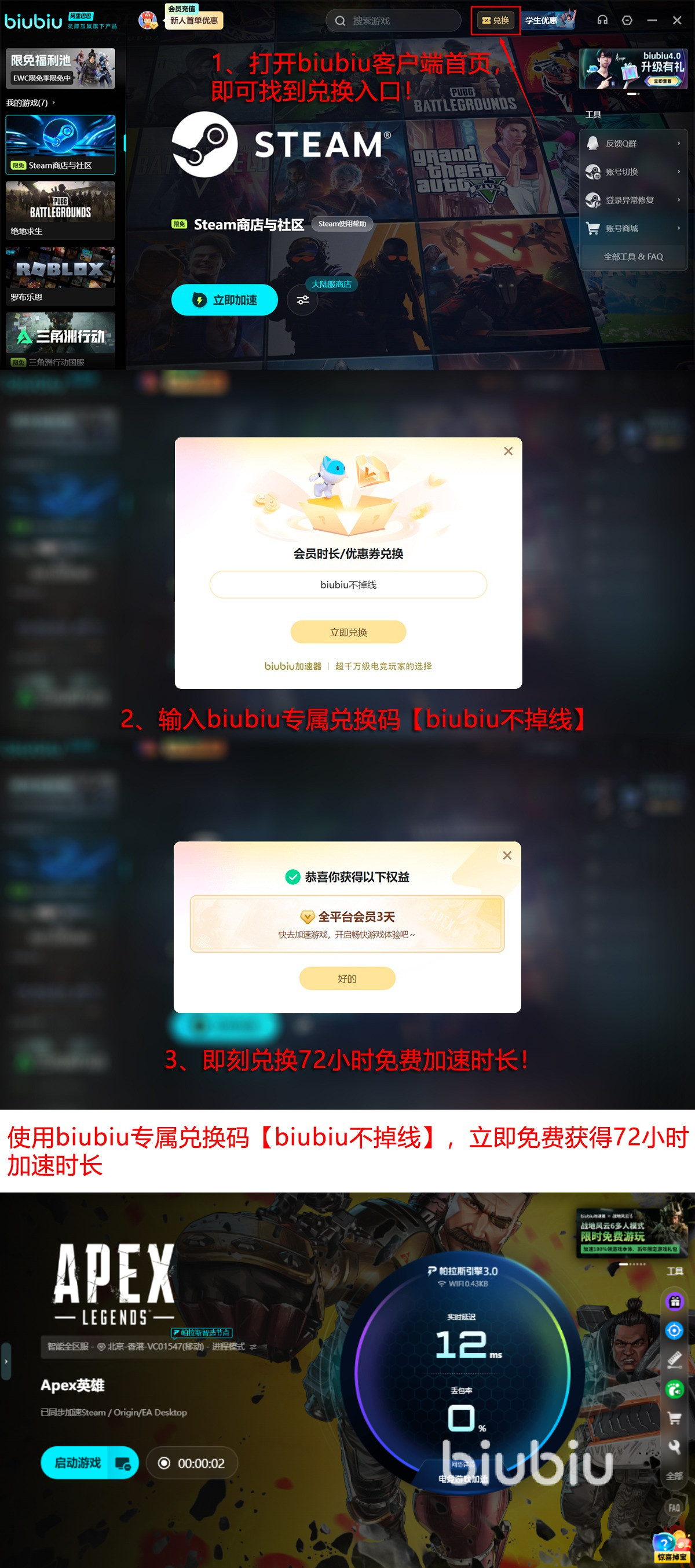 新用户注册即可获得24小时全功能免费试用权限;输入激活码【biubiu不掉线】还可额外领取72小时加速时长,累计享96小时无门槛体验,零费用验证实际加速效果。