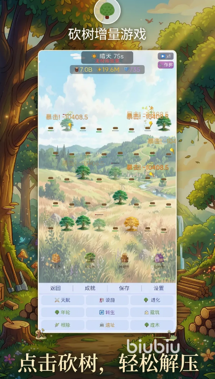 成长路径清晰明确:从初始手持小斧砍伐幼苗起步,逐步积累木材与金币,解锁更高效伐木工具、提升砍伐倍率、激活自动采集技能,并拓展林场规模。每一次数值跃升都伴随视觉强化与音效反馈,强化玩家对进度掌控感和养成满足感。