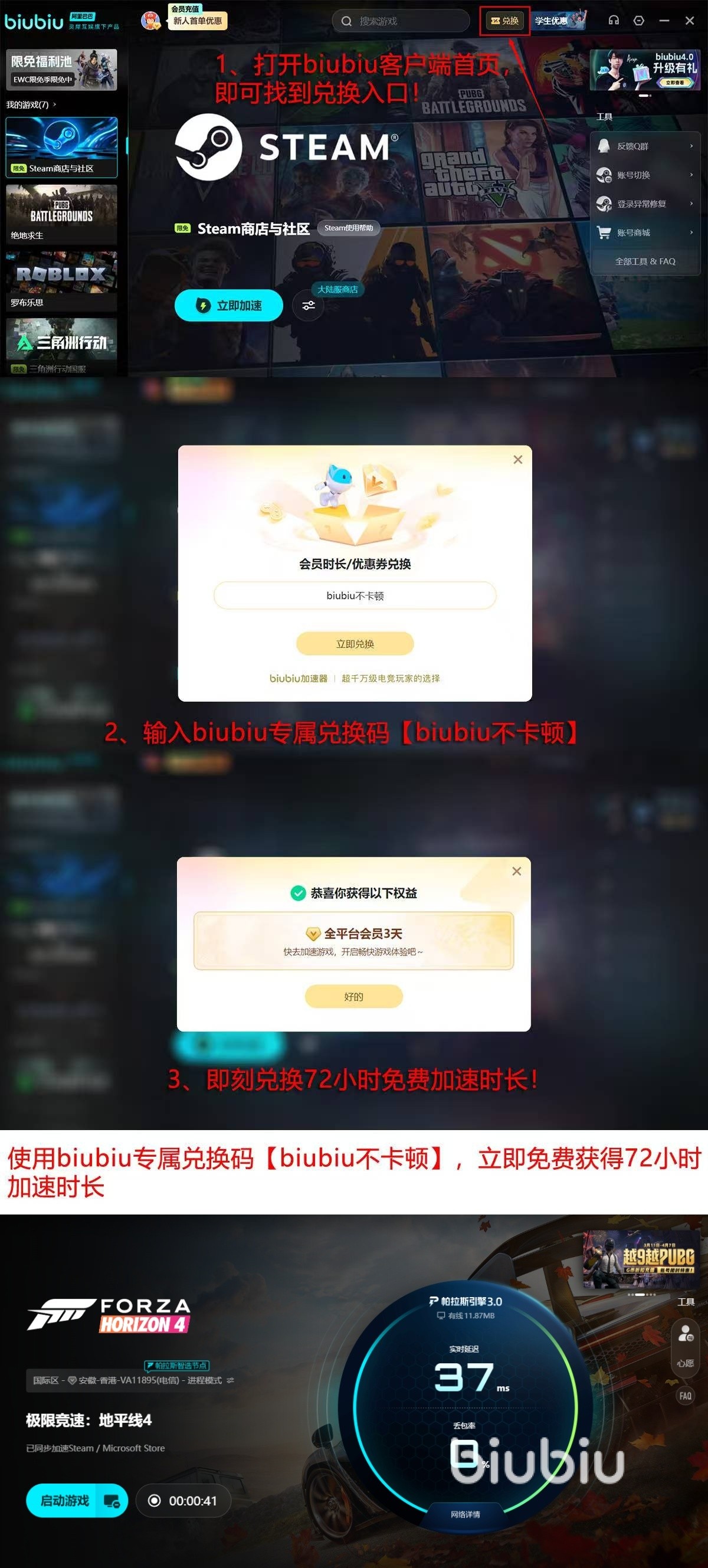 为了让所有新玩家可以能够免费体验稳定高效的游戏加速效果,新用户首次注册biubiu加速器,就能直接领取24小时免费加速时长,找到兑换福利的专属入口,输入专属兑换码【biubiu不卡顿】还能再领取72小时超长免费加速时长,叠加一共96小时超长免费加速时长,全程全面支持地平线4稳定游玩护航、超大地图加载数据同步,所有功能全部开放无限制!