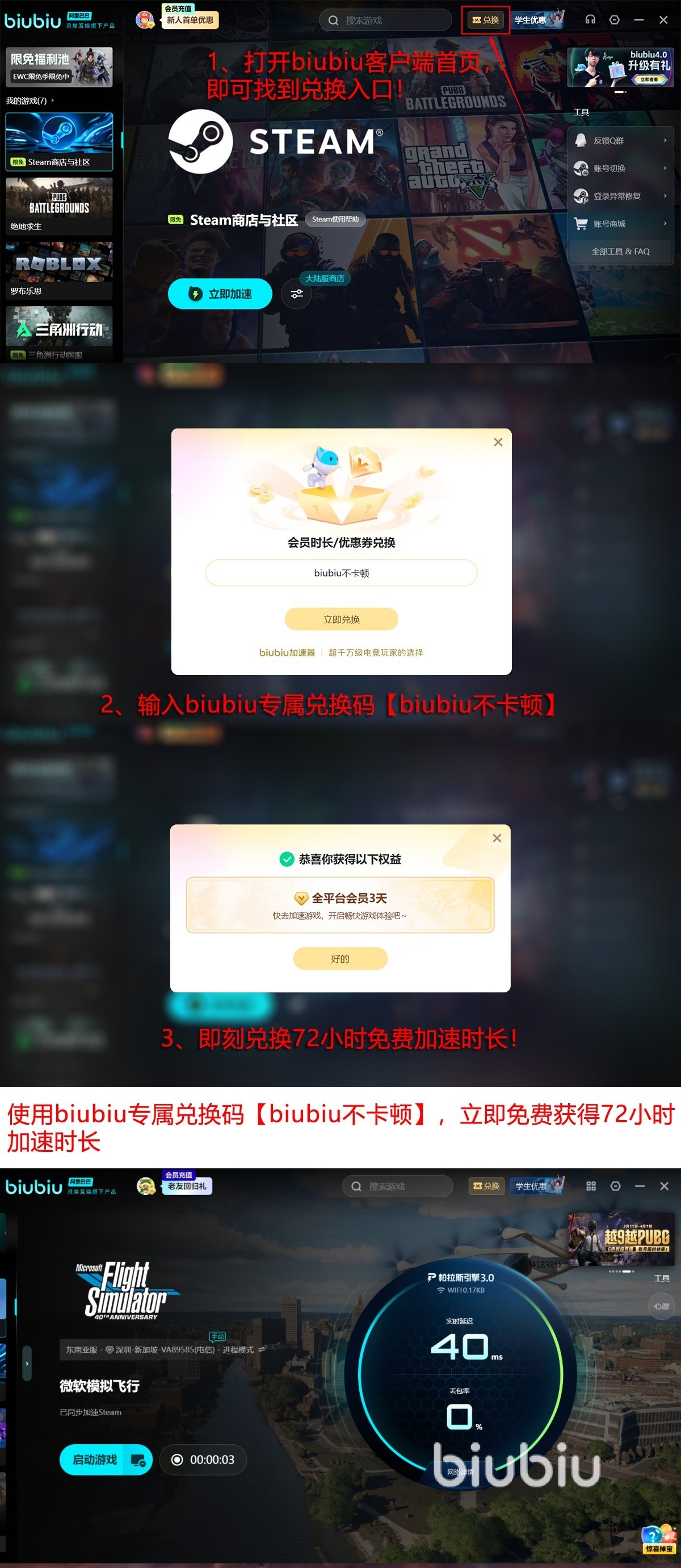现在biubiu加速器还给到新用户24小时的免费加速福利,同时不管是新用户还是老用户,现在都可以输入兑换码【biubiu不卡顿】领取3天的免费加速。如果你是新用户相当于可以免费白嫖4天的加速时长,尽情享受畅快游戏。