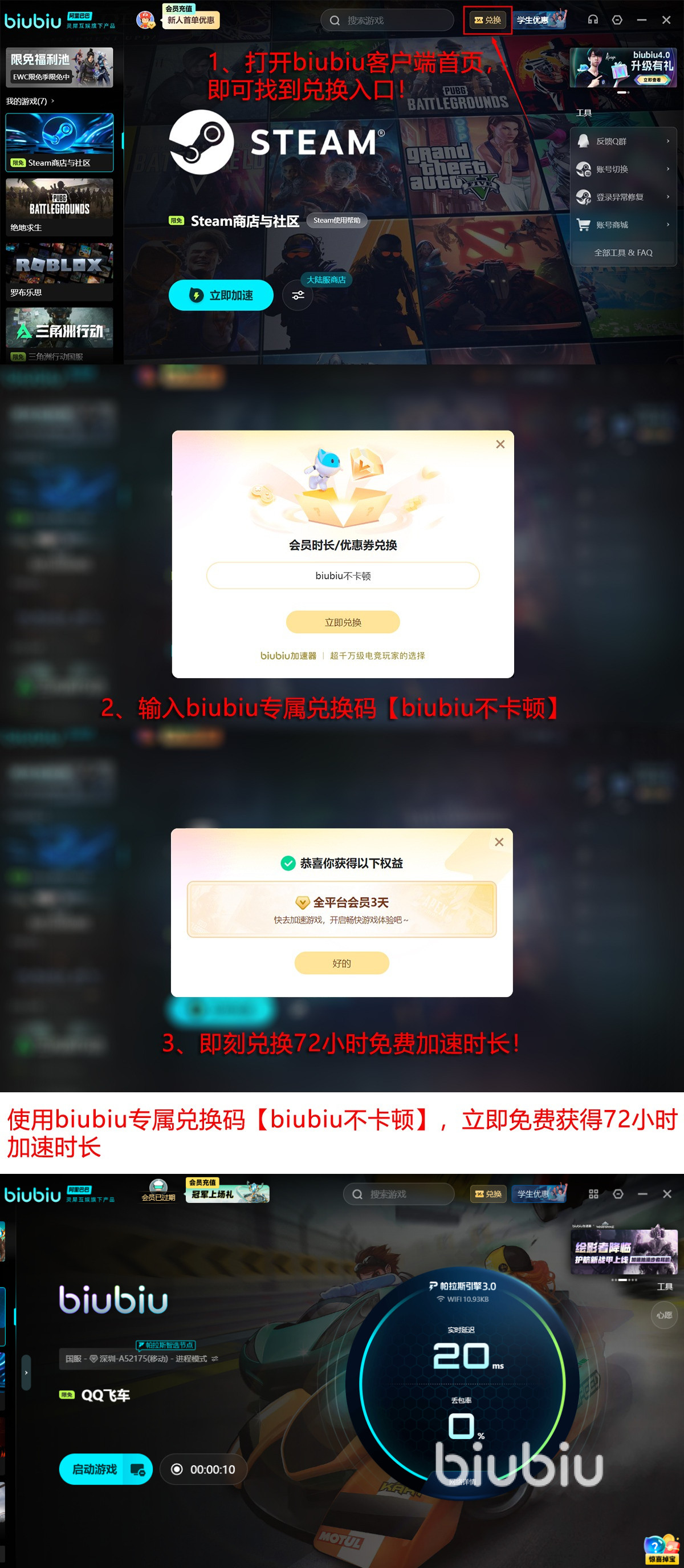 此外它还升级了多路发包技术,可保证大家能准确操作游戏人物,画面变得顺滑流畅避免抖动!现在使用biubiu玩各类佳作的话,还能获得各种福利哦!首先新人注册后就能获得24H全平台免费加速,除了qq飞车外其他游戏也能畅玩!然后新老用户都可输入口令【biubiu不卡顿】兑换72H免费加速。如果一次性使用两种福利就能获得96H,当然就算时间用完了也能体验大量的限免热游!