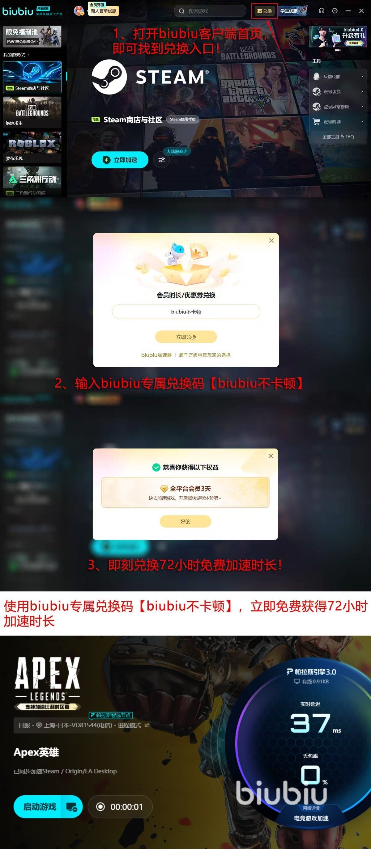 新用户首次启动biubiu,即可获得24小时加速机会,“biubiu不卡顿”在对应界面输入这个口令,额外的3天会员权益直接到账,叠加可获取4天免费时间。