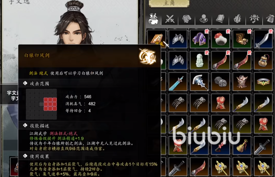 技能机制方面,《白猿归风剑》具备三层成长体系:基础状态下,每次释放可为角色叠加1层聚气效果;连续使用可在下一回合再叠加1层,最多维持两回合聚气状态。当剑法等级升至5级时,自动解锁被动技“春风化雨”,使每次攻击附带15%概率恢复自身当前气血上限5%的血量;升至10级后,进一步激活强化效果——每次攻击结束时恢复1点身法值,并对目标额外造成100点固定伤害。该伤害不随装备或等级浮动,属稳定增益型输出加成。