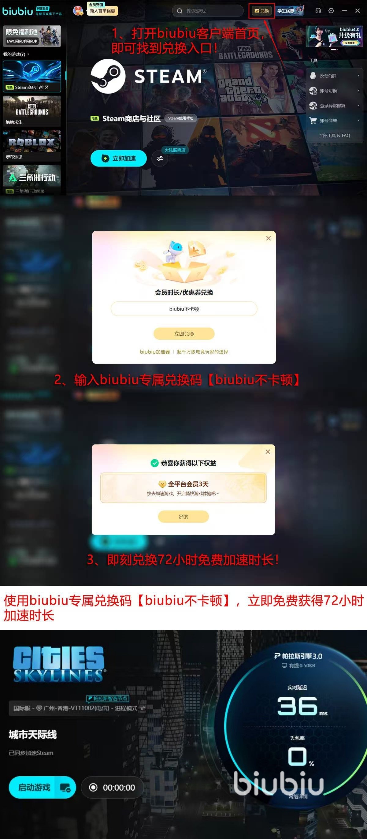 当前biubiu加速器面向新用户提供双重激活权益:注册即赠24小时全节点免费试用;进入首页兑换中心,输入专属口令【biubiu不卡顿】,可额外领取72小时加速服务。该口令不限账号新老,仅限首次使用生效。新用户可同步叠加两项权益,累计获得96小时连续加速周期,完整覆盖大型城市从初期基建到百万人口规模运营的全阶段需求。