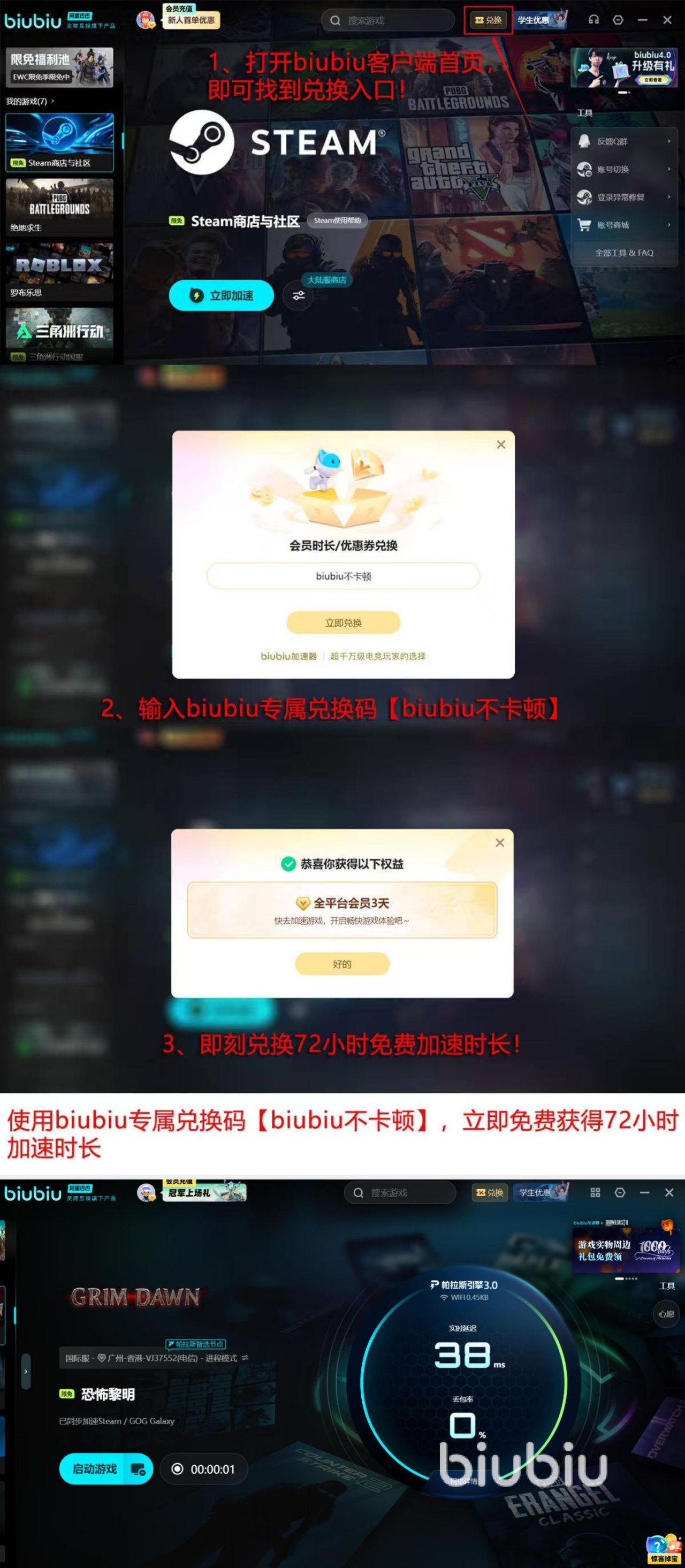 为降低体验门槛,平台同步开放限时福利:新用户完成注册后即可领取24小时免费加速时长,无需任何付费操作;使用完毕后,输入兑换码【biubiu不卡顿】还可额外获取72小时加速权限,累计达96小时,足以覆盖中短期高频游玩需求。