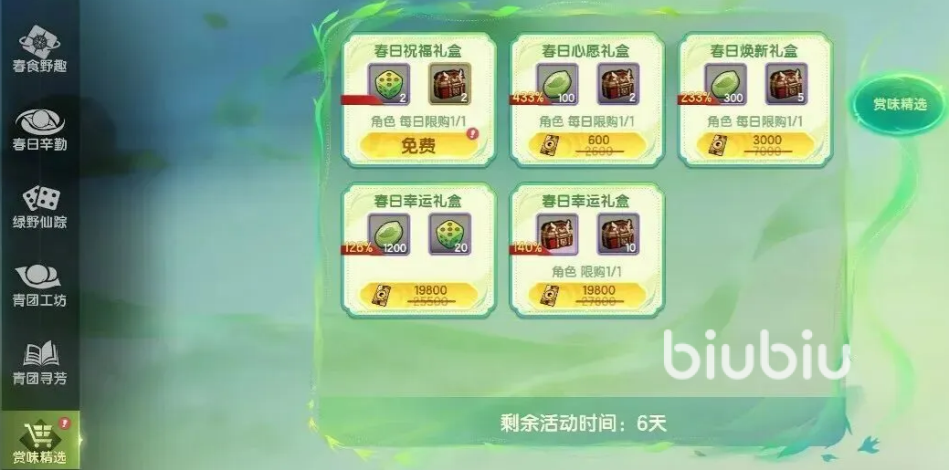 “赏味精选”礼盒系统提供分层福利策略。每日可免费领取春日祝福礼盒,内含踏青骰子与全材料随机包;另设多档付费礼盒选项,其中春日幸运礼包第二款直接附赠梦幻女孩时装,为外观党提供明确获取路径。