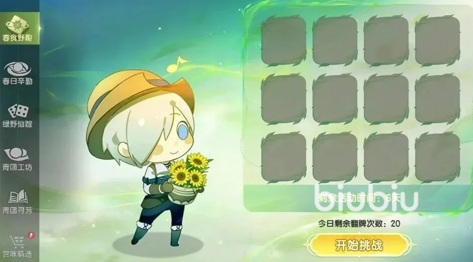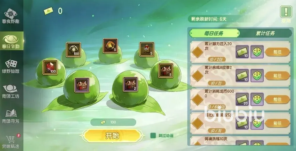 活动共设七大独立模块,结构清晰、操作便捷,无需复杂操作即可高效参与。首推玩法为“春食野趣”翻牌系统——每日开启一次翻牌界面,随机获得踏青骰子、强化石、潜能原石等实用养成材料。该玩法零门槛、无消耗,适合所有等级玩家每日稳定领取基础资源。