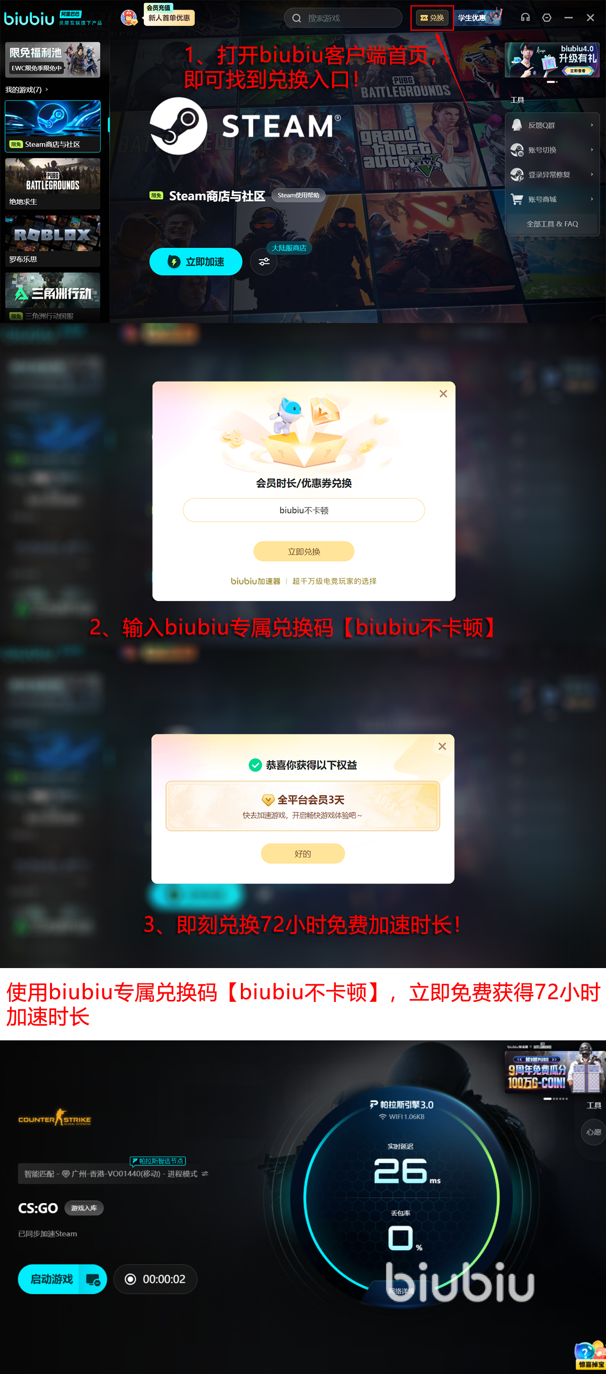 新用户首次登录即可激活24小时全功能免费加速权限。所有用户输入口令【biubiu不卡顿】,还可额外获得72小时加速时长,覆盖早中晚多时段及Dust2、Inferno、Mirage等主流地图的完整测试周期。平台当前支持超千款游戏限免加速,涵盖《CS2》国服、Steam服及主流主机平台联机服务,无订阅门槛,即开即用。