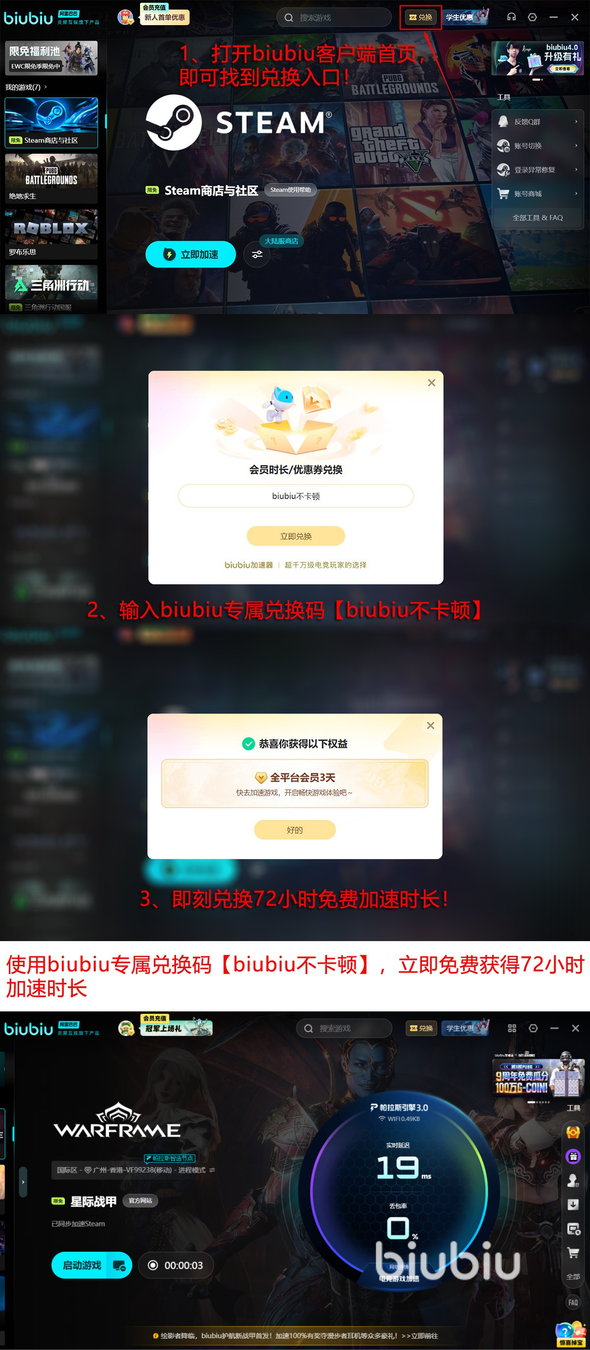 针对尚未使用过网络加速服务的新用户,平台提供零门槛体验机制:新注册账号即可领取24小时全功能加速权限;若需延长使用周期,输入专属口令【biubiu不卡顿】还可额外激活3天加速时长。该权益面向所有用户开放,每位账号限用一次;新用户间邀请叠加后,最高可累计获得96小时连续加速服务,充分满足测试、开荒及高强度PVP需求。