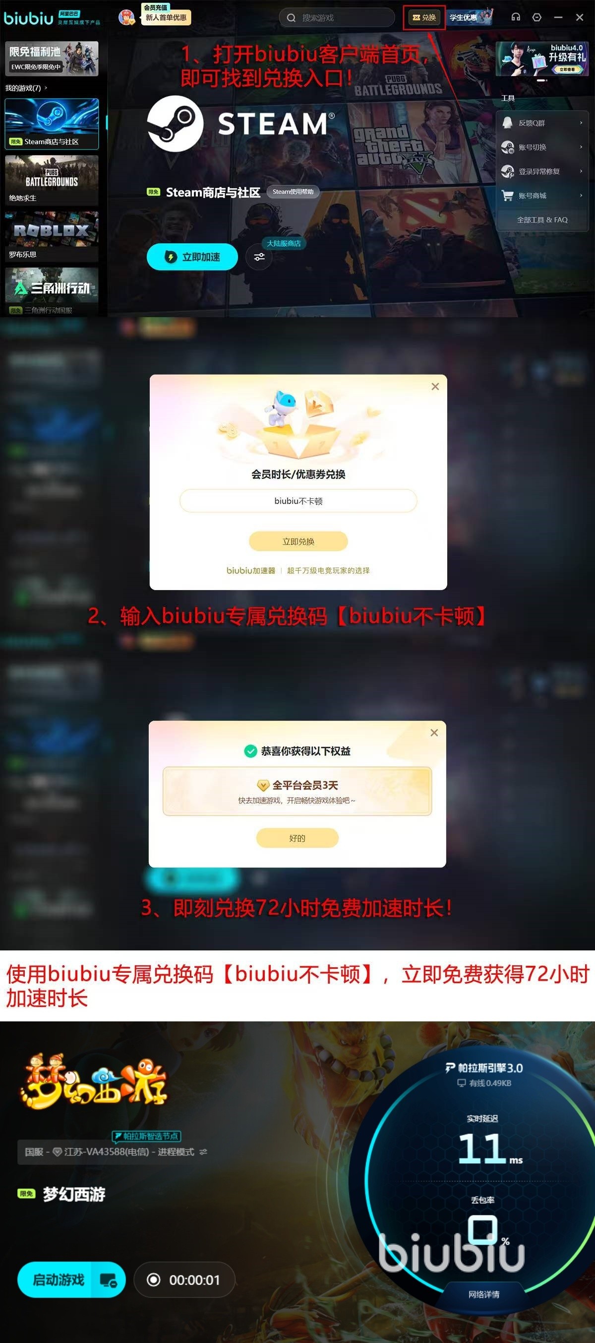 当前平台推出限时福利政策:新注册用户可享24小时全功能免费试用;所有用户输入兑换码“biubiu不卡顿”,即可额外领取72小时高级会员加速权益,覆盖全部服务器与跨区功能,无需绑定支付方式即可体验完整服务。