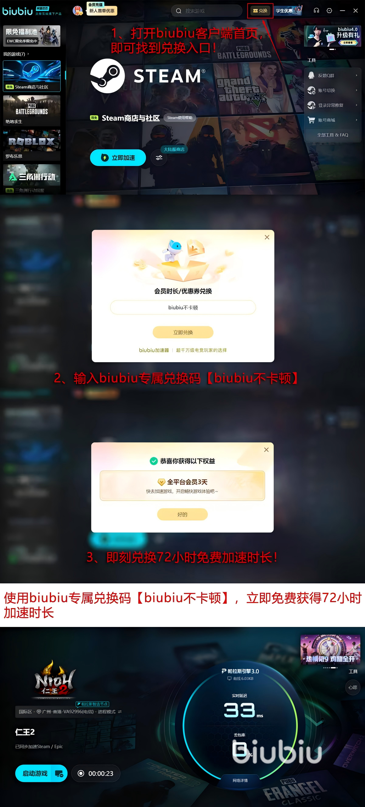 新用户注册即可领取专属福利:包含价值礼包及24小时免费加速时长。此外,所有账号(含新老用户)均可前往首页兑换栏输入【biubiu不卡顿】,额外获得72小时加速权益。两项叠加后,新用户最高可享连续96小时无限制加速服务,为《仁王2》多周目挑战及联机协作提供坚实支持。