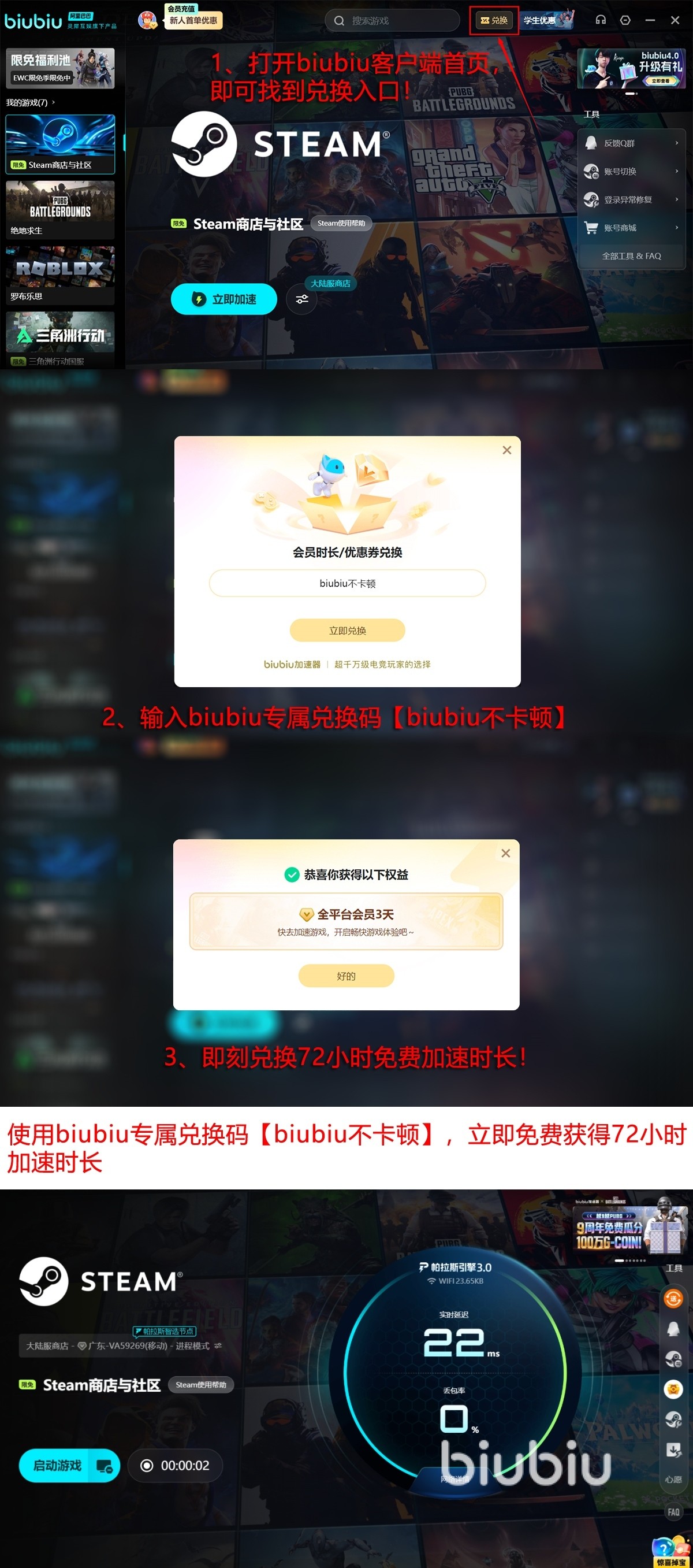 目前新用户注册即可获赠24小时全功能免费体验权限。所有用户输入兑换码【biubiu不卡顿】,可额外领取3天无限制加速服务——覆盖PC端及主流主机平台,支持任意游戏、任意节点自由切换,便于全面评估优化效果,切实感受操作跟手度与画面流畅度的双重提升。