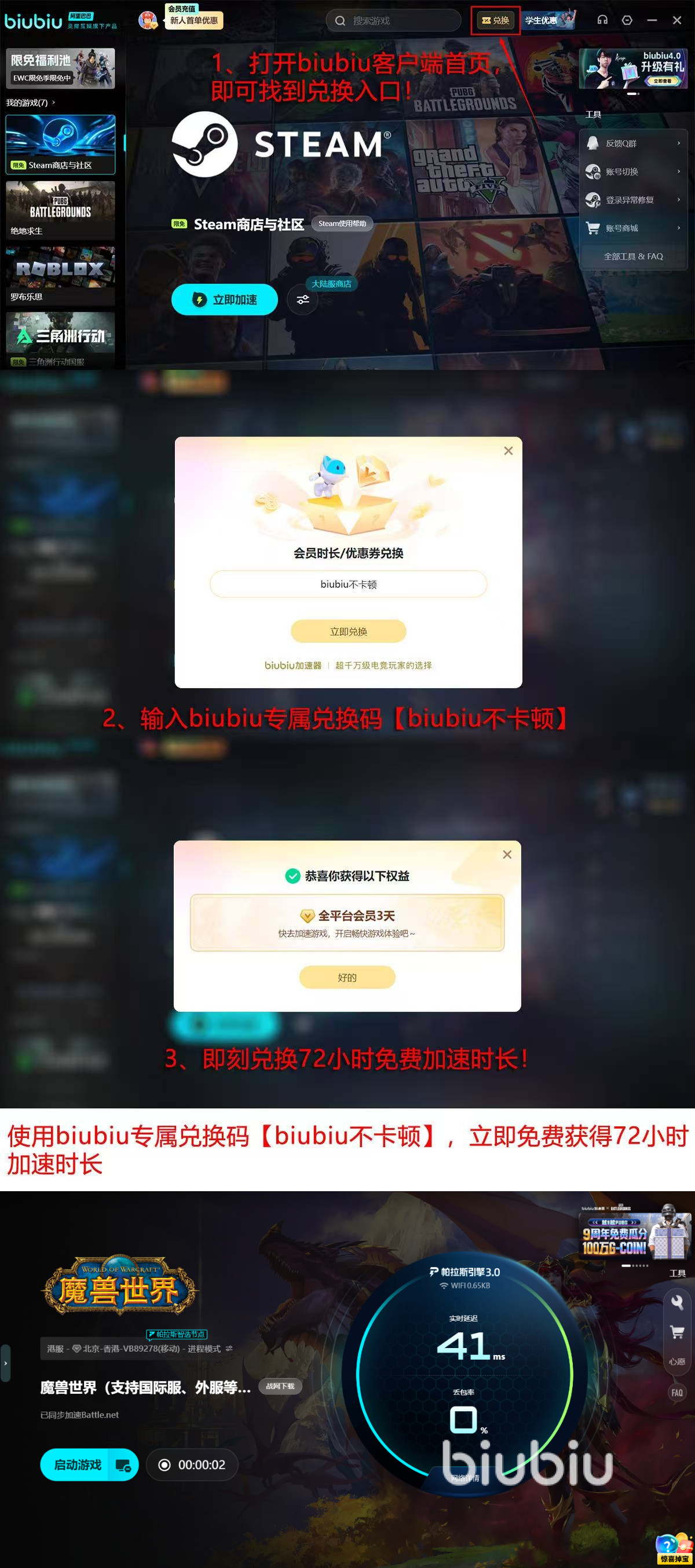 新用户注册biubiu加速器账号后,可立即激活24小时全功能免费试用权限;在激活界面输入专属口令【biubiu不卡顿】,额外获赠72小时加速服务时长。两项权益叠加,总计可享受96小时无限制深度体验,覆盖完整开荒周期与赛季初冲分阶段。