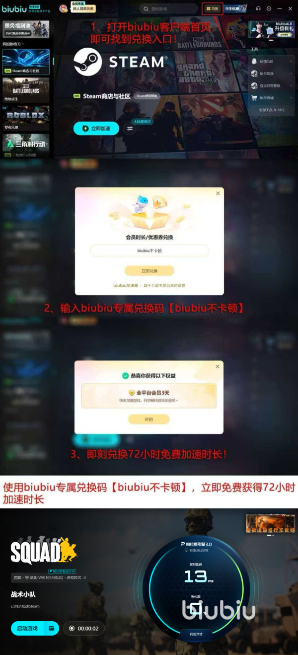 别再让突发闪退打断你的战术部署节奏!即刻下载biubiu加速器,新用户可享24小时免费试用;所有用户输入兑换码【biubiu不卡顿】,即可额外领取72小时加速时长,累计达96小时无忧体验。
