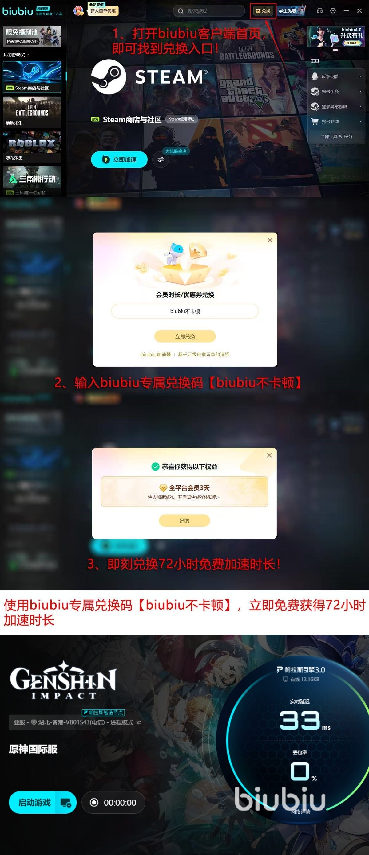 网络层面,地理距离是影响国际服延迟的核心变量。原神国际服服务器主要部署于新加坡、洛杉矶、法兰克福等节点,中国内地玩家直连需跨越多重骨干网与国际出口带宽,数据包经多次路由跳转后易产生抖动与丢包。常规网络优化手段(如DNS切换、QoS设置)收效有限。此时采用专业游戏加速工具可显著改善传输效率——biubiu加速器支持智能节点优选与TCP/UDP双协议加速,依托帕拉斯引擎3.0实现路径优化与数据包预加载,有效降低端到端RTT(往返时延)。该方案已通过高强度压力测试验证,包括由PUBG全球总冠军小叮当参与的实战场景模拟,实测在高峰时段可将平均延迟压降至80ms以内,丢包率趋近于0%。