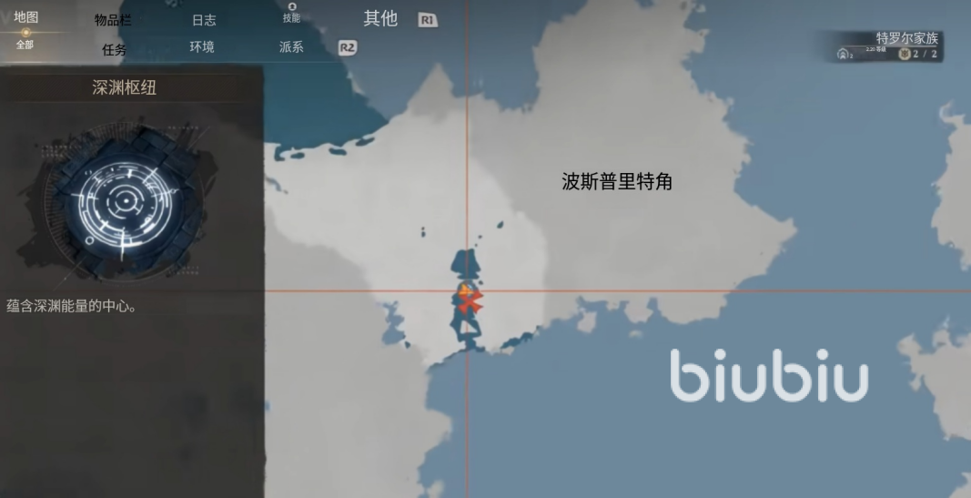 前往波斯普里特角西侧湖泊——深渊枢纽所在区域。目标为一组呈阶梯状排列的矩形岩柱山体,攀爬至顶端后进入洞穴入口。