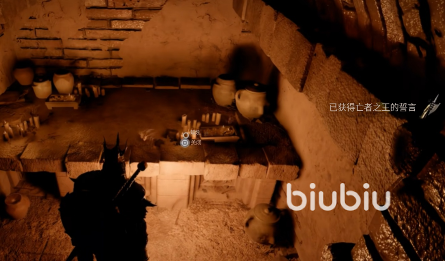 下降途中可见一处低矮窄口,形似犬道。匍匐穿行后进入密闭空间,墙角堆叠数个木桶。最左侧木桶旁存在微小角度限制,需略微调整视角触发拾取UI,即可获得堕落国王的短剑。