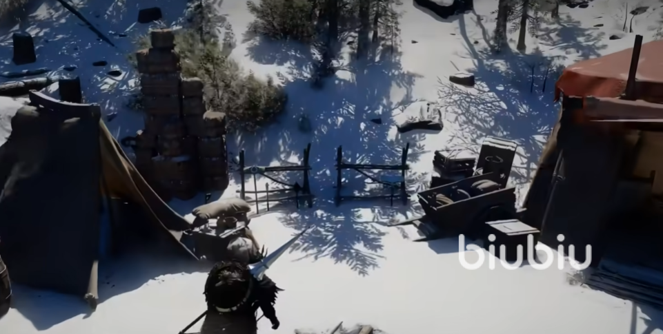 靠近左侧小帐篷,在其右侧首个木质置物架上斜倚放置该武器。将镜头准心对齐,交互提示自动弹出,拾取即得骨坑巨锤。