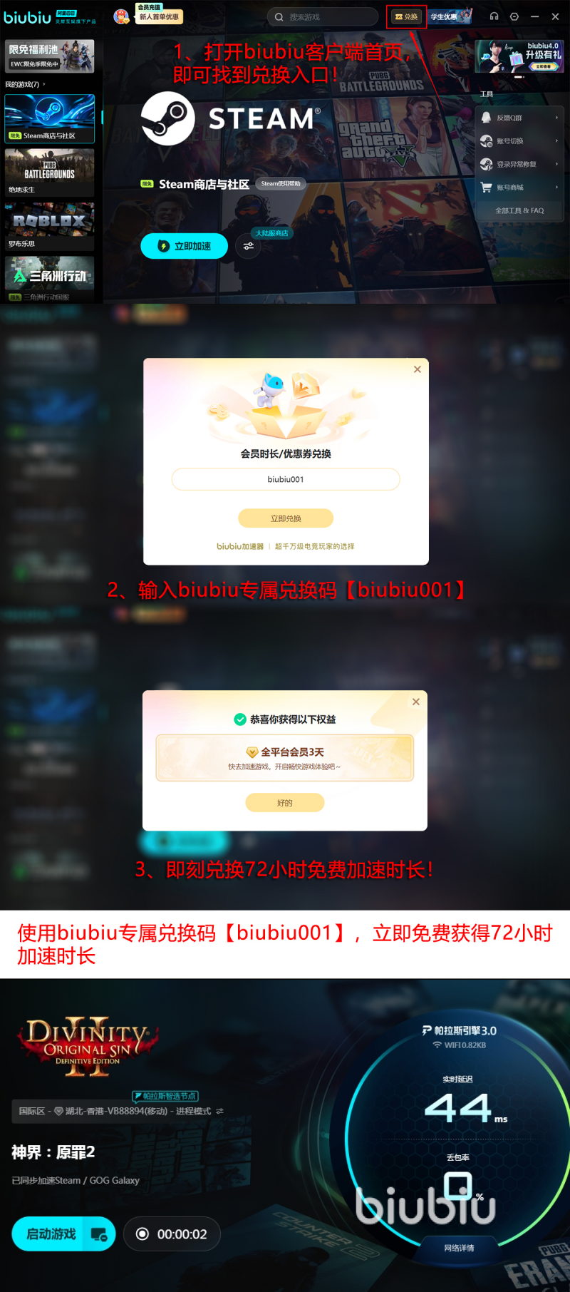 当前新用户注册并首次启动biubiu加速器,即可获赠24小时免费加速时长。此外,输入专属兑换码【biubiu001】还可额外领取3天连续使用权。两项权益叠加后,总计可享受96小时无限制加速服务,充分覆盖中长周期的游戏加载与联机需求,显著提升整体运行流畅度。