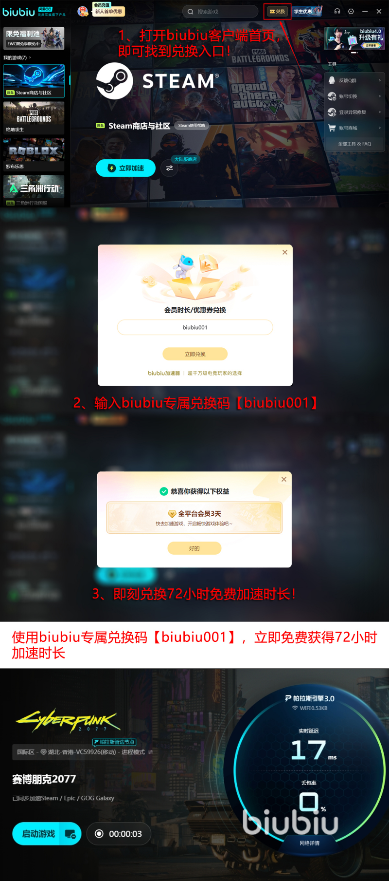 目前biubiu加速器面向新用户提供零门槛试用机制:完成首次注册即可激活24小时全功能加速权限;同步输入兑换码【biubiu001】,还可额外领取3天免费时长。两项权益叠加后,最高可享96小时无限制加速服务。试用期内所有功能完整开放,网络延迟抑制、丢包补偿及节点切换响应等核心指标均维持标准水平,确保玩家流畅体验夜之城的每一个细节。
