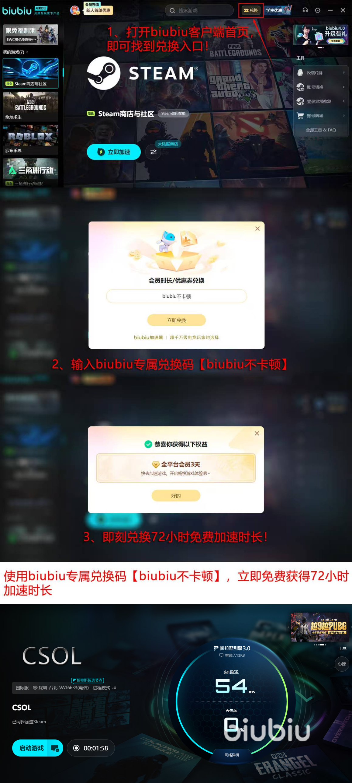 为降低用户体验门槛,biubiu加速器提供分层式免费权益:新用户完成注册后,系统自动发放24小时全功能加速时长;所有用户均可在兑换码栏输入【biubiu不卡顿】,额外获得72小时连续加速权限。两项叠加总计96小时,覆盖多日高频次CSOL登录及大灾变、生化模式等资源加载需求。