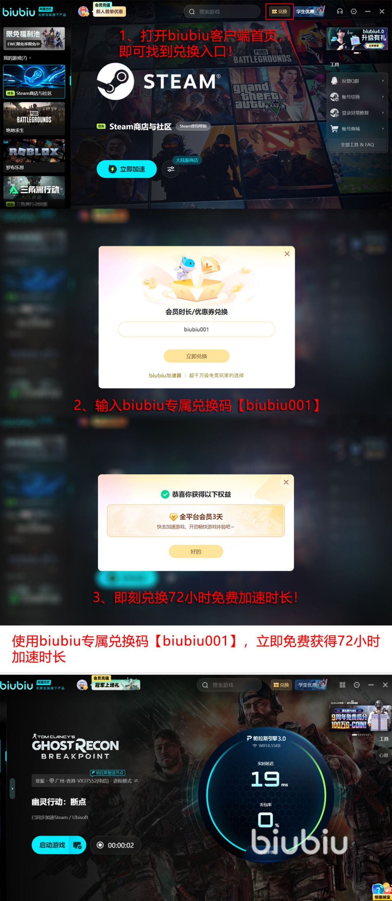 技术层面,其搭载自研帕拉斯3.0智能调度引擎,可在弱网环境或高峰流量时段自动识别并切换至最优传输路径,大幅降低丢包率与端到端延迟。新用户注册并首次激活账号,即可获得24小时免费试用时长;试用结束后,输入专属兑换码【biubiu001】还可额外领取72小时服务权益。两项福利叠加使用,总计可享96小时完整体验周期。