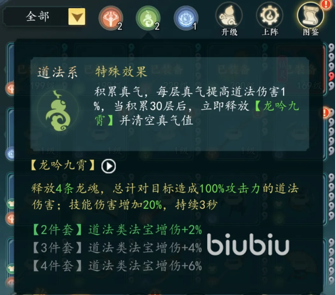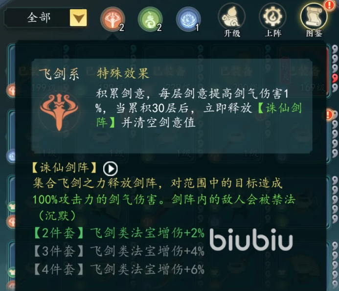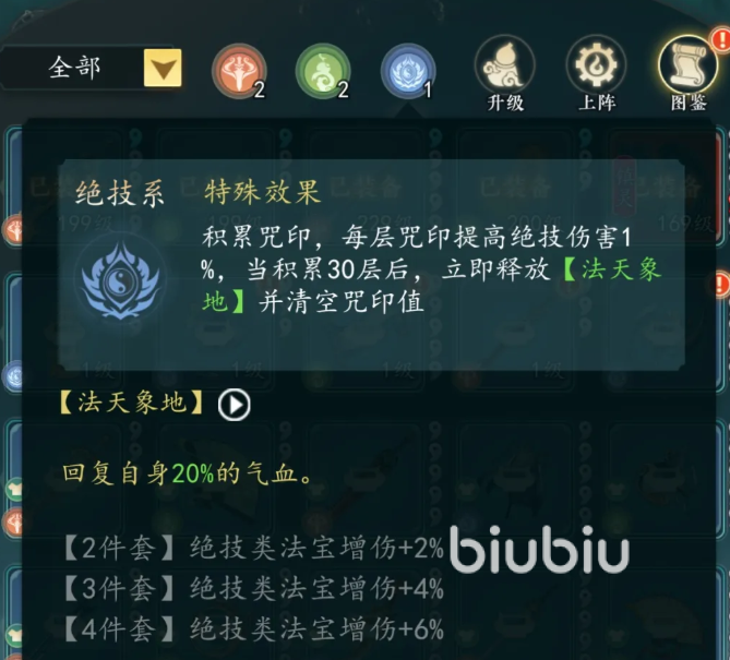 具体来看,飞剑系法宝每次释放自动积攒1层剑意,叠满30层后触发剑气范围伤害,并附带沉默效果;道法系法宝则持续累积真气,达30层时激活额外20%全伤害加成;绝技系法宝通过印咒积累,满30层后恢复自身20%最大气血。三者机制差异显著,决定了其在阵容中的功能不可替代。