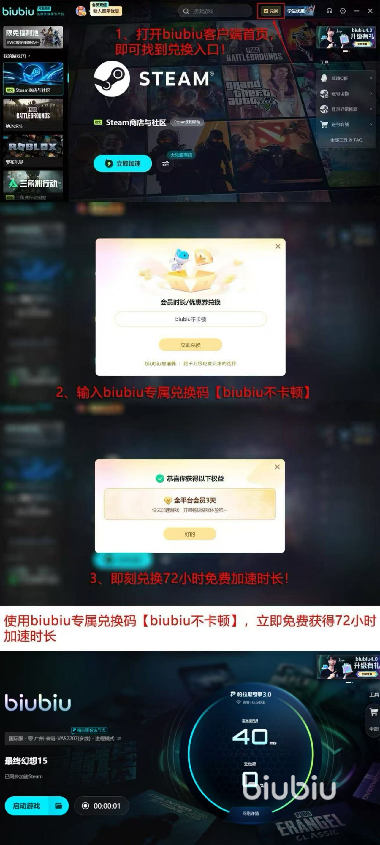该工具由专业团队自主研发帕拉斯3.0加速引擎,通过智能路由优选、TCP/UDP双栈优化及本地缓存预加载技术,显著改善数据传输效率,杜绝传统加速中常见的“忽快忽慢”现象。代言人XDD小叮当为PUBG职业赛事冠军选手,其日常训练及直播均采用该加速方案,进一步印证其实战可靠性。新用户注册后可即时获得24小时免费加速时长;输入兑换码【biubiu不卡顿】还可追加72小时权益,总计96小时无门槛体验,零成本验证加速效果。