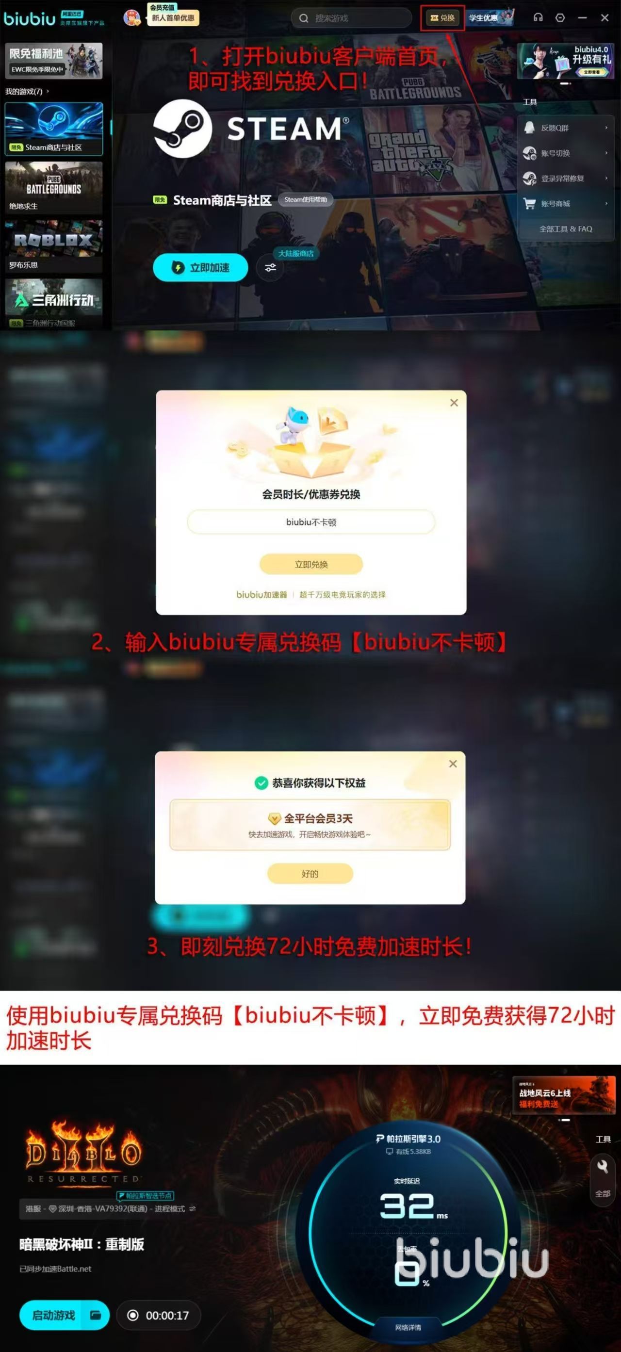 在用户权益方面,biubiu加速器提供切实可用的免费方案:新注册用户完成登录后,系统自动发放24小时全功能加速时长,无需任何付费操作即可完成全流程测试;所有用户(含老用户)均可通过输入通用兑换码【biubiu不卡顿】,额外领取72小时加速权限。累计四日免费使用周期,足以覆盖《暗黑破坏神2》多周目通关所需,真正实现零成本解决闪退困扰。