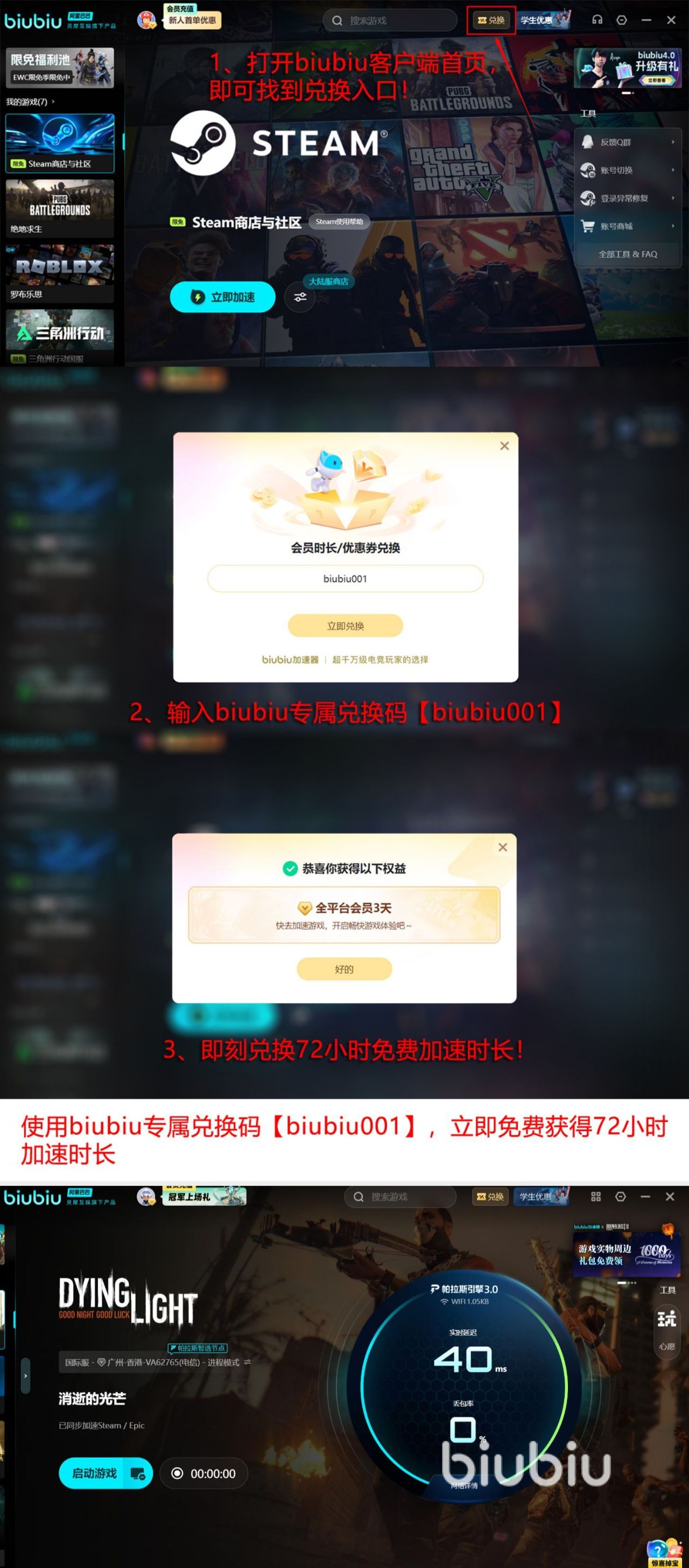 新用户注册后即可无门槛启用免费试用功能,首次登录即赠24小时全游戏加速时长。通过输入专属口令【biubiu001】,可额外激活72小时高级加速权益。综合累计,新用户最高可享连续96小时(即4天)的免付费加速服务,充分满足《消逝的光芒》多周目通关、联机合作及高难度挑战等多样化使用需求。4天的时间,让你享受欢乐惊喜的同时,也能够任意加速游戏自由探索。