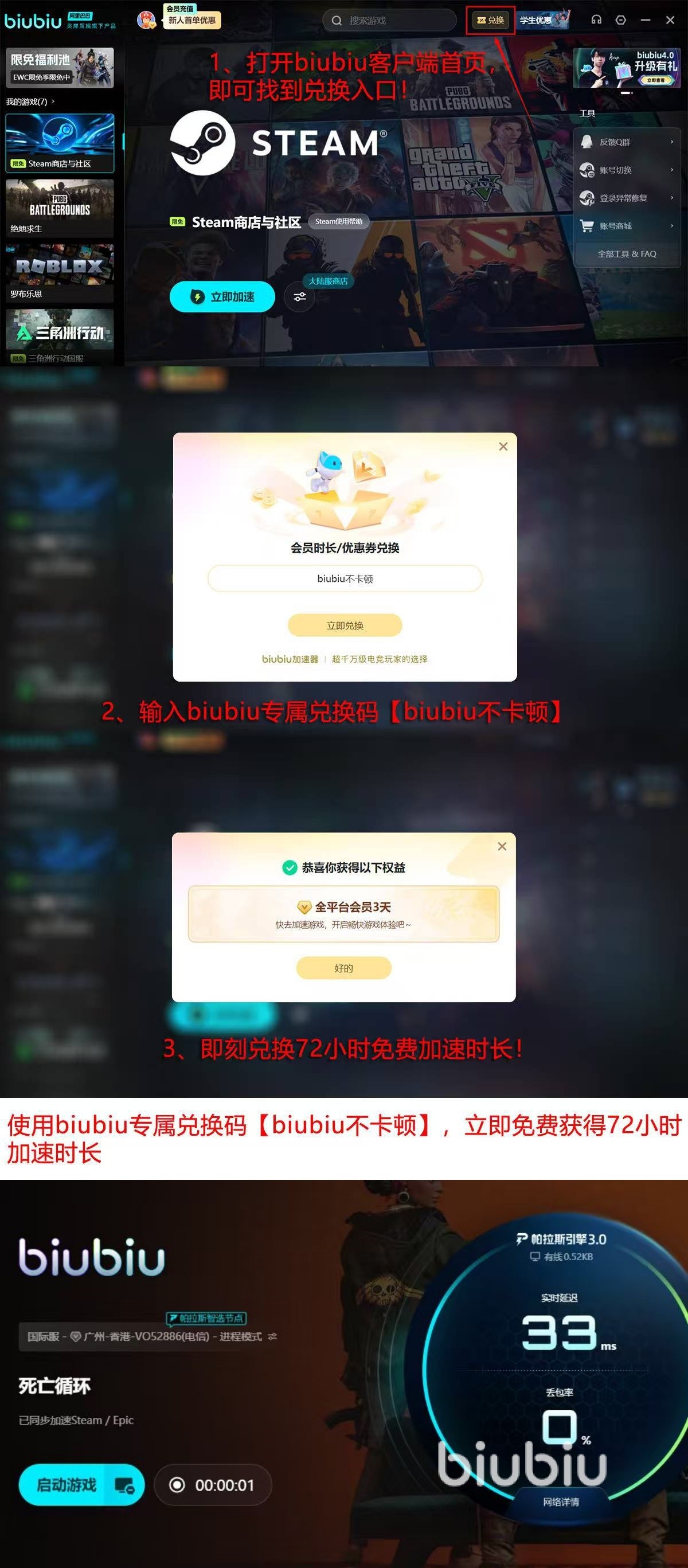 根据近期用户反馈统计,biubiu加速器在《死亡循环》专项优化场景下平均降低延迟达42%,连接成功率提升至99.3%。新注册用户可直接领取24小时全功能加速时长,无需预充值即可实测效果。如需延长体验周期,可在账户中心进入兑换页面,输入专属激活码【biubiu不卡顿】,额外获得72小时加速权限,累计享有多达96小时的新手专属福利。