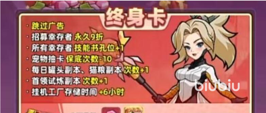 长期玩家可评估终身卡价值:除广告屏蔽外,包含稀有角色85折购入权、额外副本次数+2、宠物抽取保底次数减半等深度权益,适用于计划持续投入30日以上的用户群体;