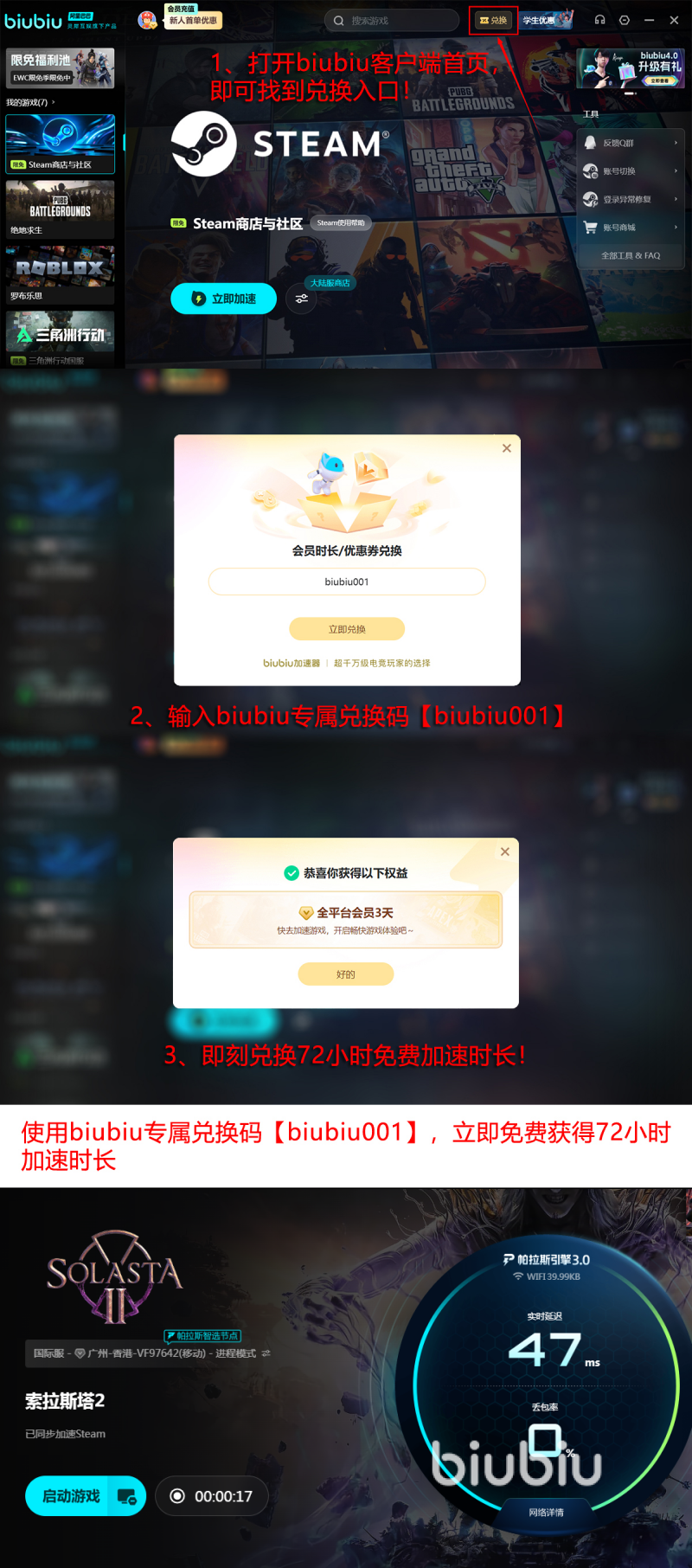 目前Biubiu加速器面向新用户提供专属激励:注册即赠24小时免费加速时长;所有用户输入兑换码【biubiu001】,可额外领取3天加速权益。两项福利叠加使用,总计可获得96小时连续加速服务,全面覆盖《索拉斯塔2》的启动异常、联机卡顿及加载失败等典型网络相关问题。
