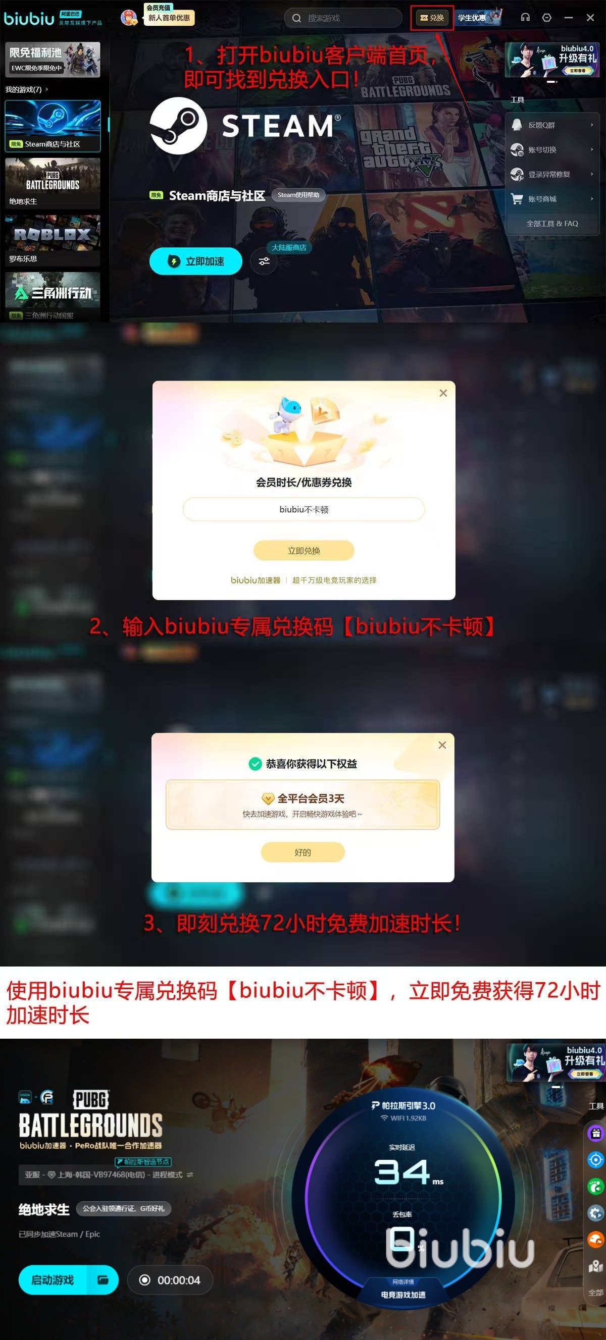 新用户注册biubiu加速器后,可立即获得24小时免费加速时长;输入专属兑换码【biubiu不卡顿】,还可额外领取72小时加速权益,总计享96小时全功能免费体验。期间不限速、不限时、不屏蔽任何游戏内功能,完全覆盖《绝地求生》全部服务器区域与玩法模式,实现零成本解决闪退、黑屏、加载失败等典型故障。