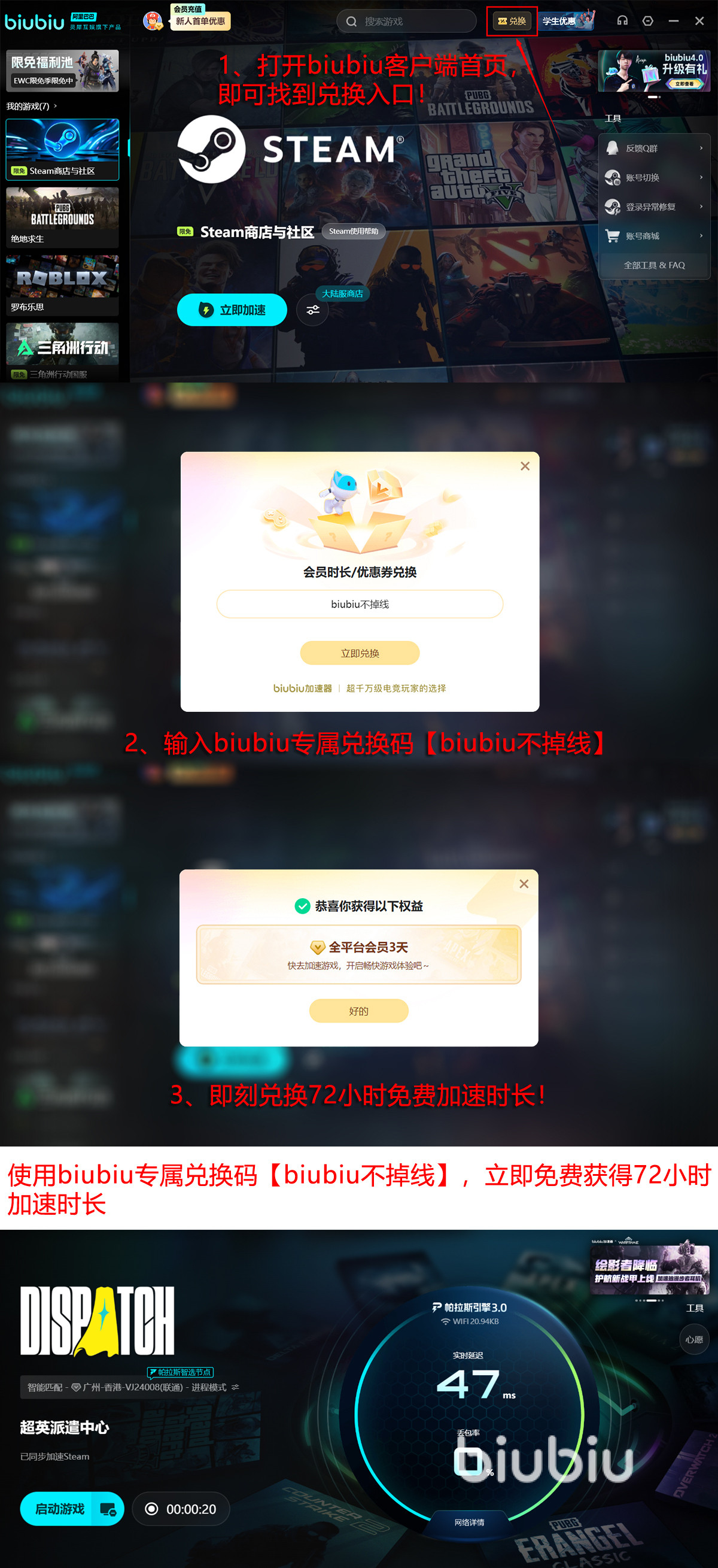 目前新用户注册biubiu加速器立享24小时全功能免费试用,输入【biubiu不掉线】,即可额外再获得72小时的免费加速时长,两项叠加,总计可畅享长达96小时的顶级加速服务。