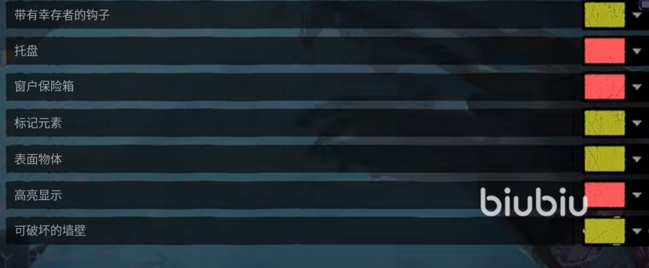 新增颜色显示,①高亮物,比如异形看特定控制台。②显示物,比如似曾相识或者爆发技能显示的发电机。③标记物,像是异形标注的特定控制台。④杀手物品,比如鬼灵陷阱,生物荚这些。⑤可破坏墙壁。