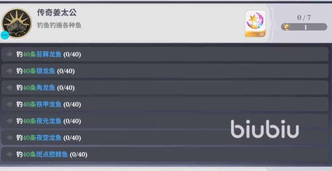 2026年04月09日 17:58 来源:小速七大罪起源中“七大龙鱼成就”如何达成?游戏内有一项名为“传奇姜太公”的荣誉称号,要求玩家成功钓取七种不同龙鱼,且每种必须达到40条。这七类龙鱼分别为:苔藓龙鱼、角龙鱼、斑点腔棘鱼、夜空龙鱼、铁甲龙鱼、夜光龙鱼,以及文中未明确命名但与“七大龙鱼”总数对应的第七种——结合上下文及成就设定,实为七种固定稀有鱼种,缺一不可。