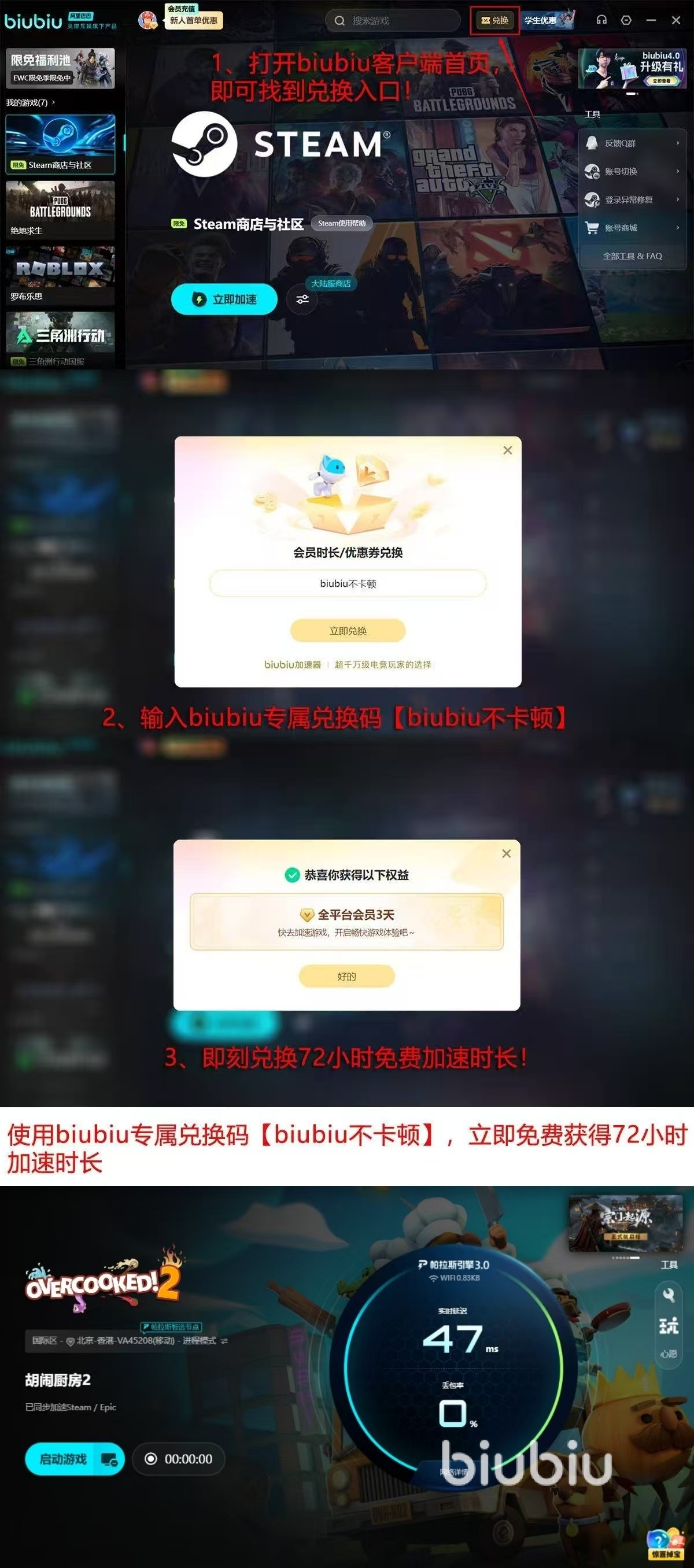 新用户完成注册即可激活首日24小时全功能试用权限;输入兑换码【biubiu不卡顿】,还可额外领取72小时加速时长,累计享96小时无限制联机优化服务。
