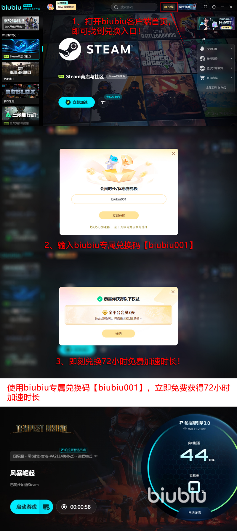 目前新用户注册即可领取24小时免费加速时长,叠加专属兑换码【biubiu001】还可额外获得3天使用权,总计可享96小时无门槛加速服务。全程无需付费,即可保障联机稳定性,让玩家专注战局推演与部队调度,彻底摆脱网络干扰带来的体验断层。