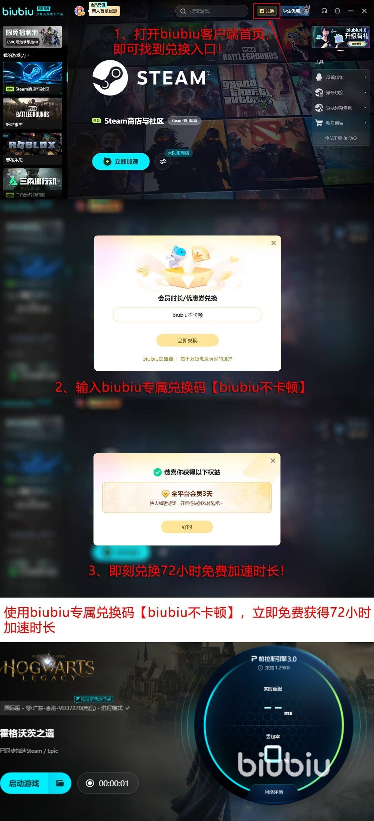 新用户注册即可获得 24 小时无门槛免费加速权益,所有用户均可参与福利活动。当前进入 App 内「兑换中心」输入激活码【biubiu不卡顿】,额外领取 72 小时连续加速权限,总计可享近 100 小时免费服务,满足整周高强度游戏需求。