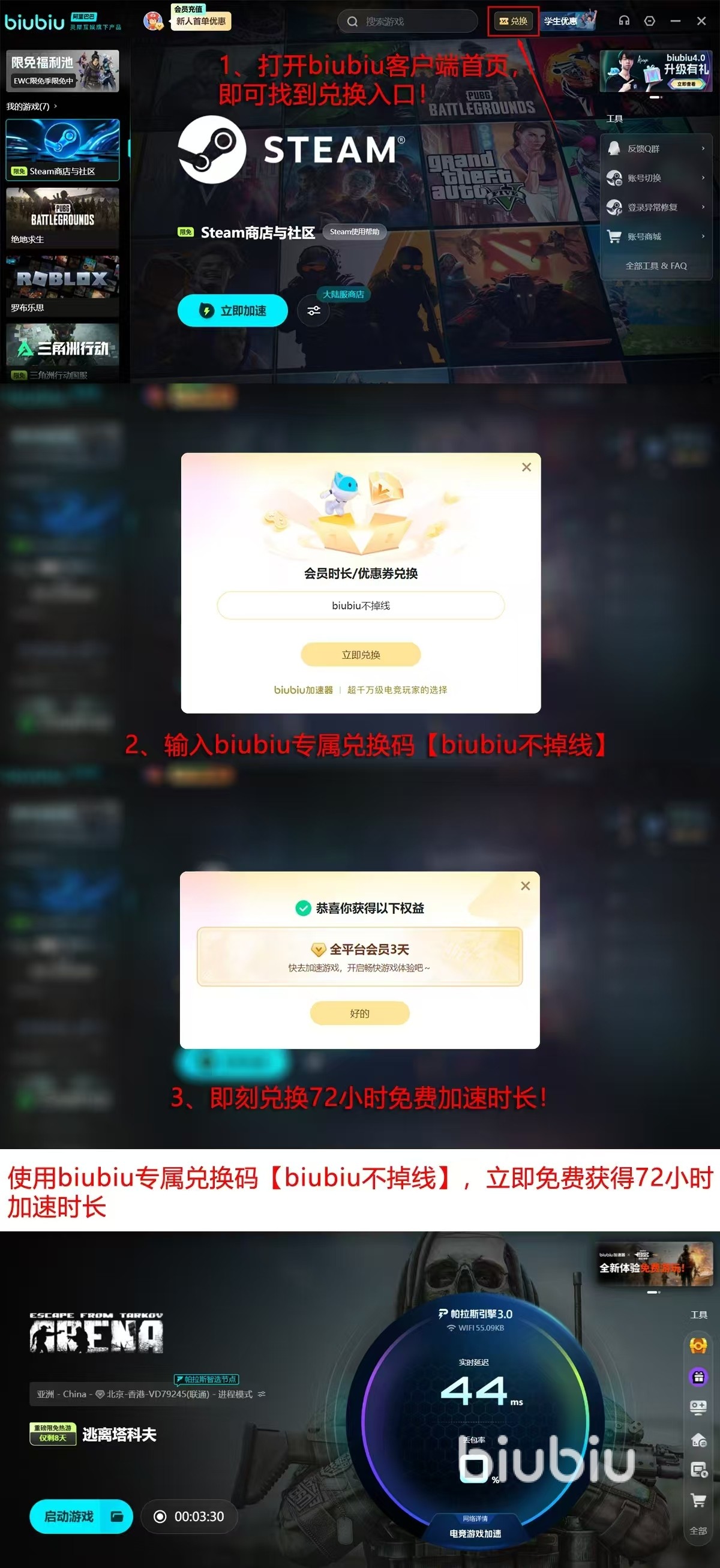 鉴于新地图对网络稳定性和设备性能提出的更高要求,推荐使用biubiu加速器进行联机优化。该工具集成帕拉斯3.0加速引擎,由阿里巴巴灵犀互娱技术团队提供底层支持,与九游、交易猫同属该体系下重点运营产品。新用户注册即可领取总计96小时免费加速时长:含首次登录自动发放的24小时,叠加输入礼包码【biubiu不掉线】获取的72小时权益。后续连续使用还可解锁阶梯式加赠福利。