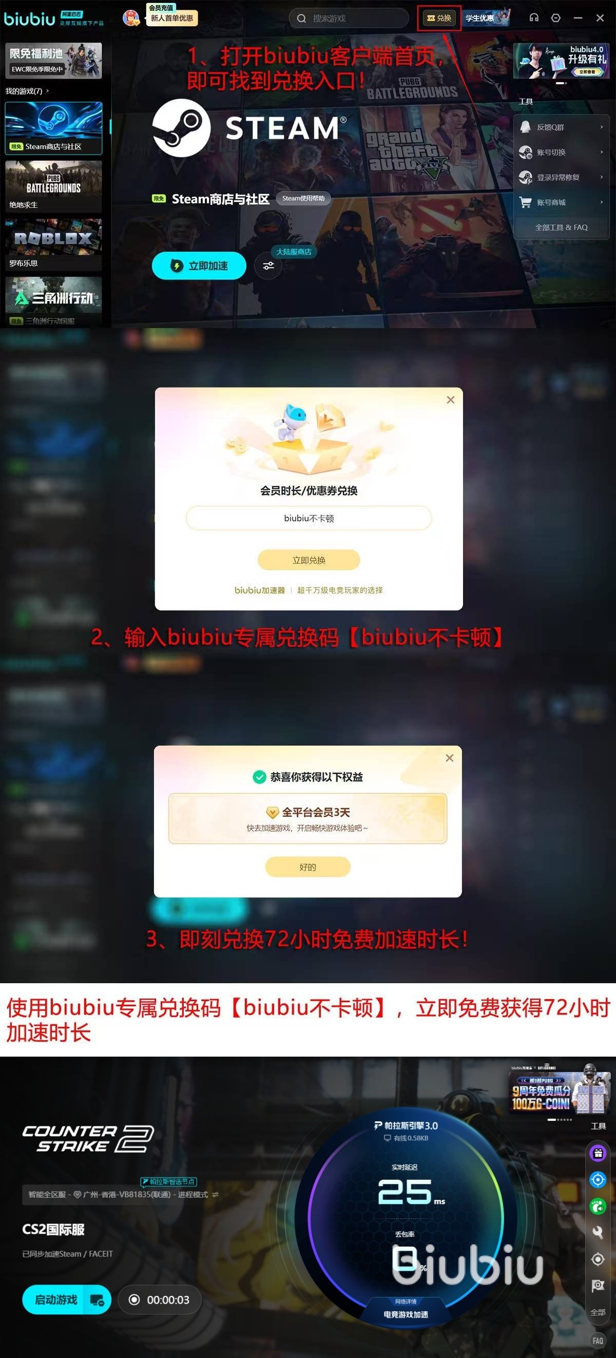 当前新用户完成注册并登录后,可立即获得24小时全节点免费加速权益;输入专属兑换码【biubiu不卡顿】,还可额外激活72小时加速时长。新用户叠加两项福利,总计享有96小时无门槛体验期,无需付费即可完整测试CS2专项优化效果。